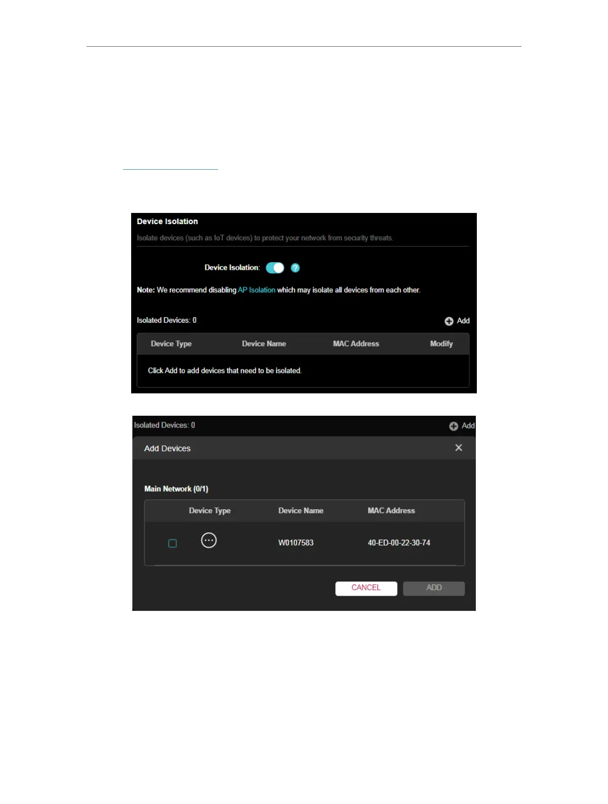 2. Go to Advanced > Security > Device Isolation. Enable Device Isolation.