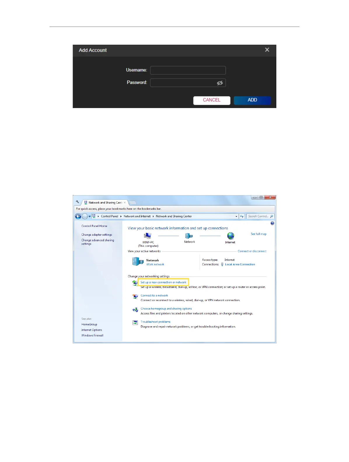 1. Go to Start > Control Panel > Network and Internet > Network and Sharing Center.