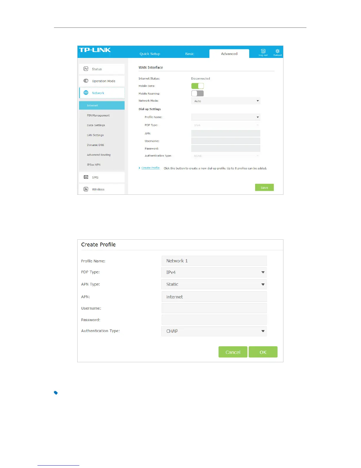 4. Specify the Profile Name, Username and Password. Select the PDP Type, APN Type