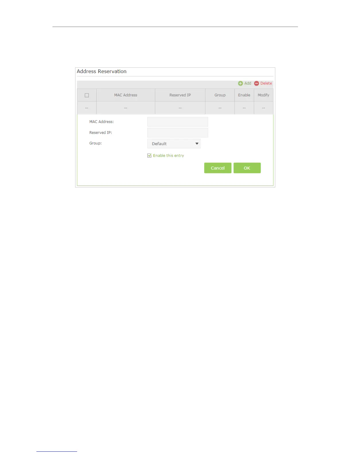 3. Scroll down to locate the Address Reservation table and click Add to add an address