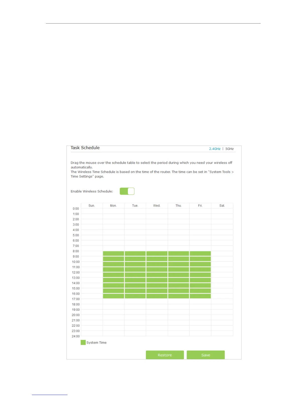 You can automatically turn off your wireless network (both 2.4GHz and 5GHz) at time