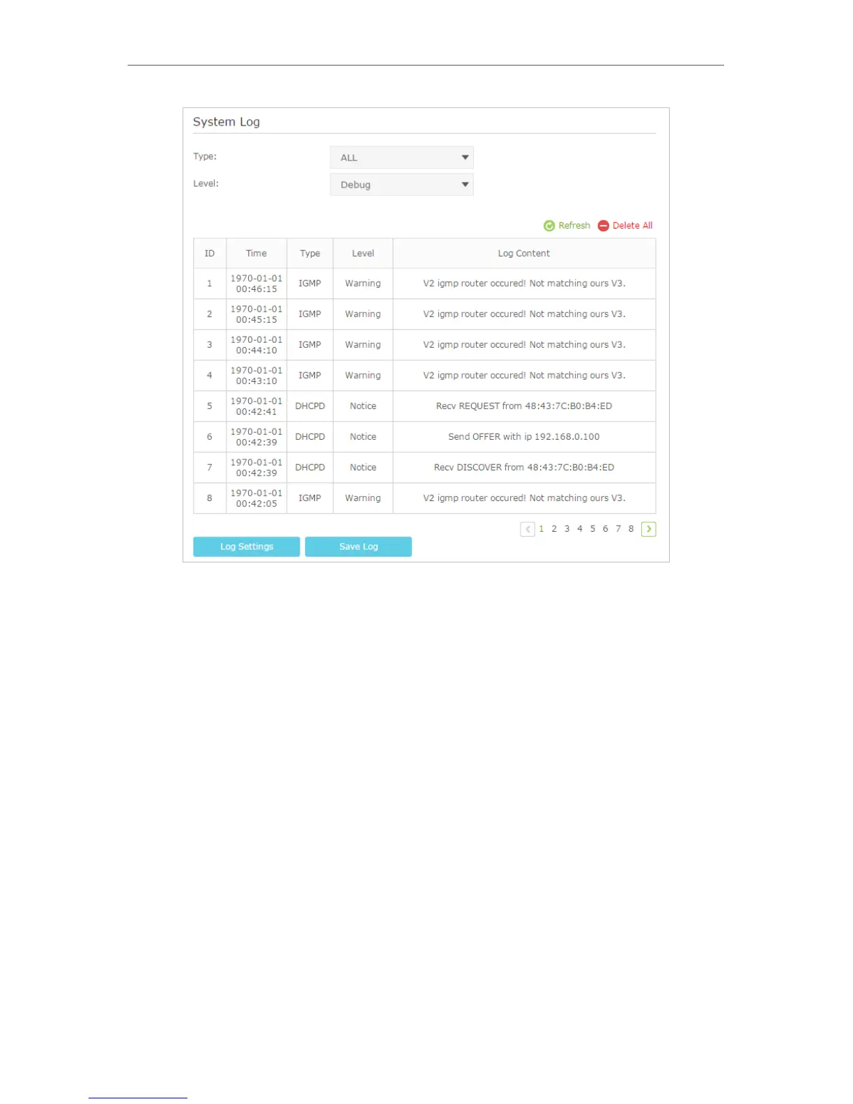 1. Select the log Type. Select ALL to view all kinds of logs, or select DHCPD or IGMP to