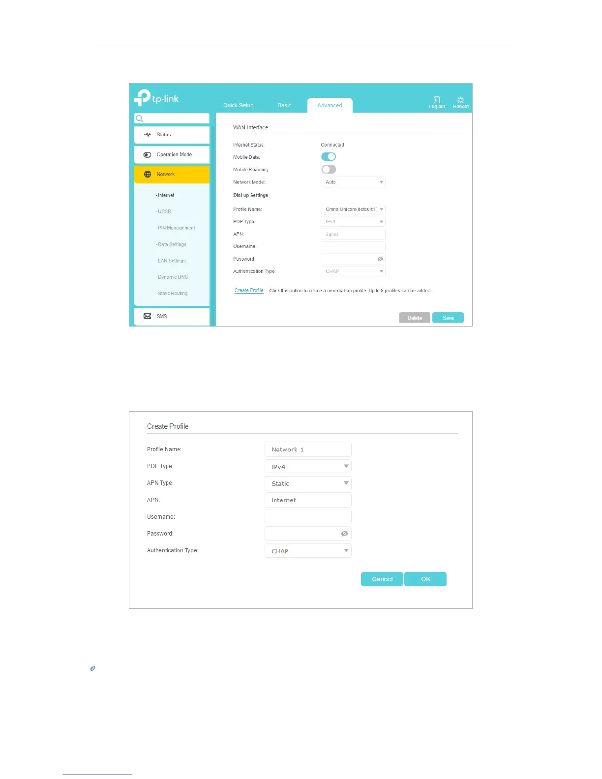 4. Specify the Profile Name, Username and Password. Select the PDP Type, APN Type