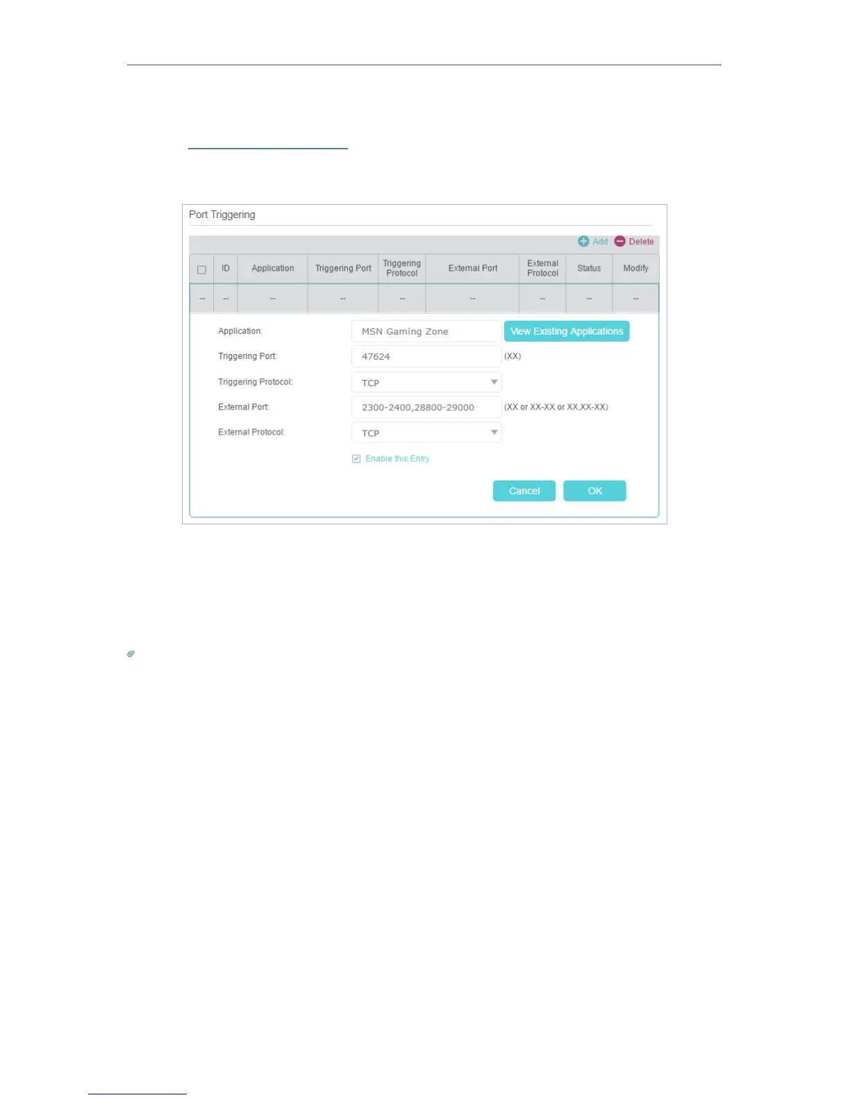 Follow the steps below to configure the port triggering rules: