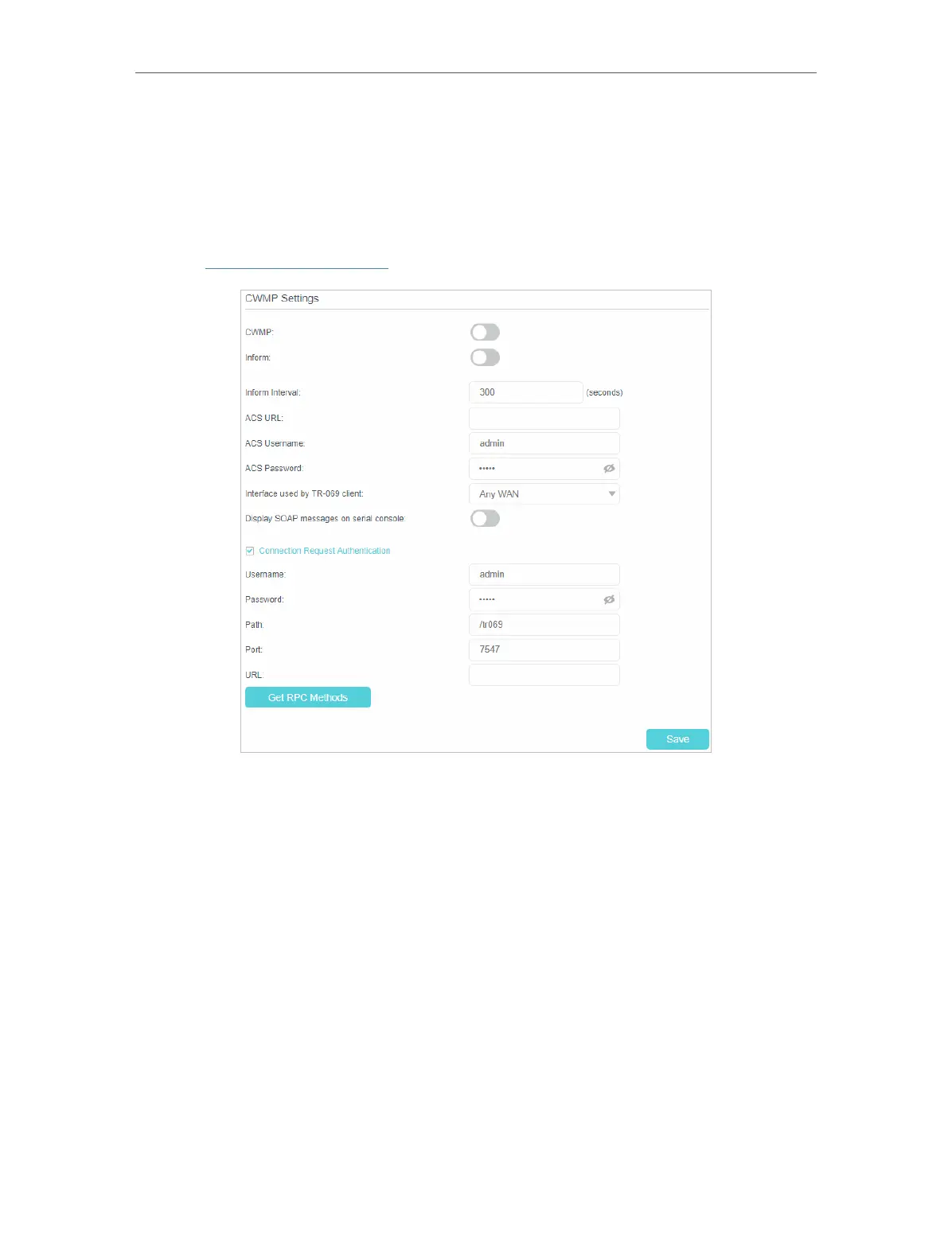 • Enable CWMP - Toggle On to enable the CWMP (CPE WAN Management Protocol)