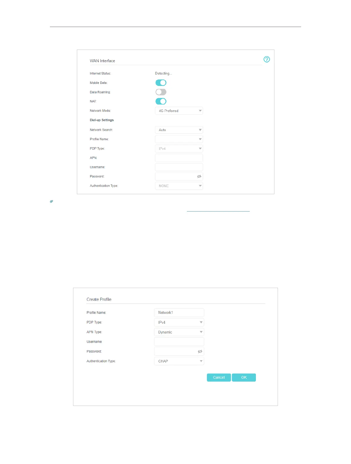 4. Specify the Profile Name, Username and Password. Select the PDP Type, APN Type