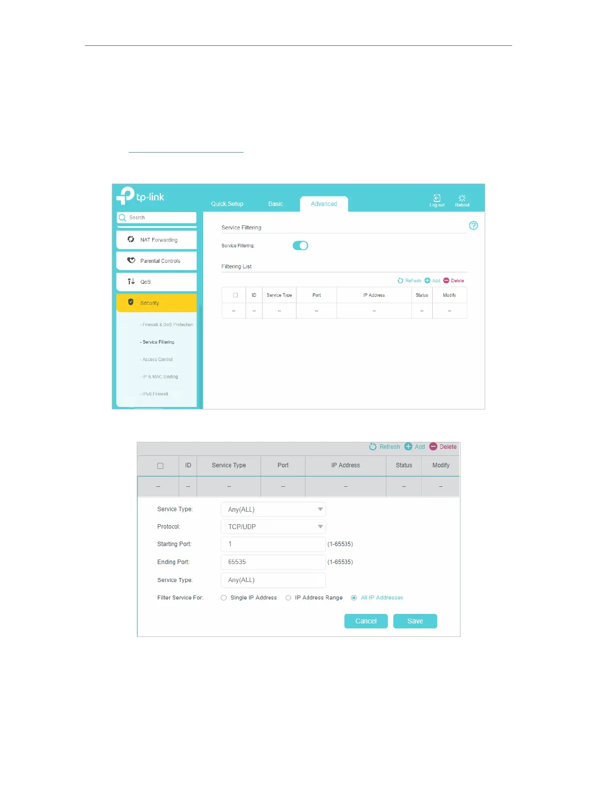 2. Go to Advanced >Security > Service Filtering and enable Service Filtering.