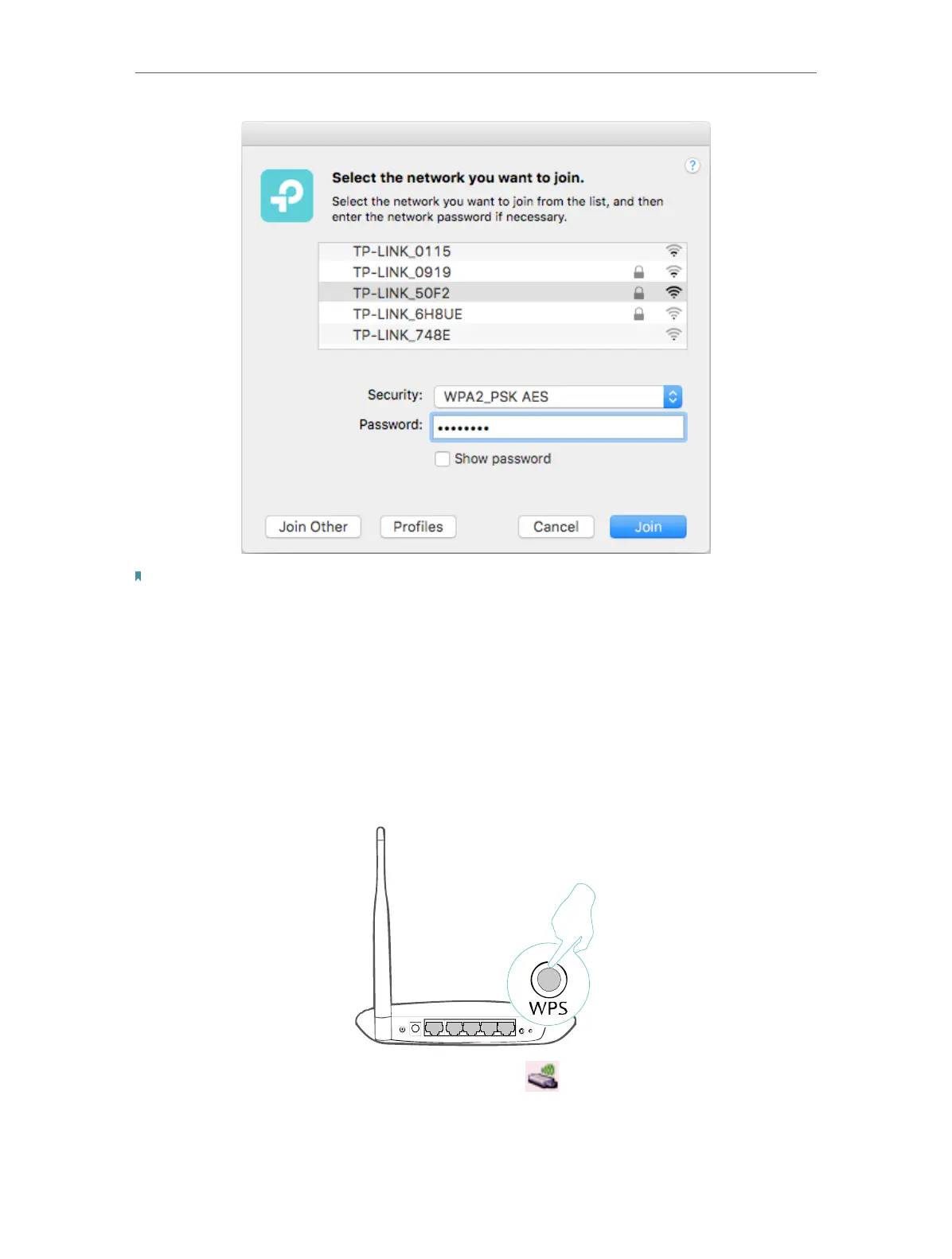 If your Wi-Fi network is not displayed in the list, you can try to join it by WPS or by clicking Join Other on the above