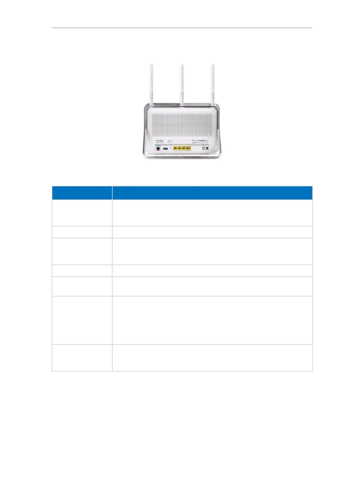 The modem router’s back panel shows the connection ports, buttons and antennas.