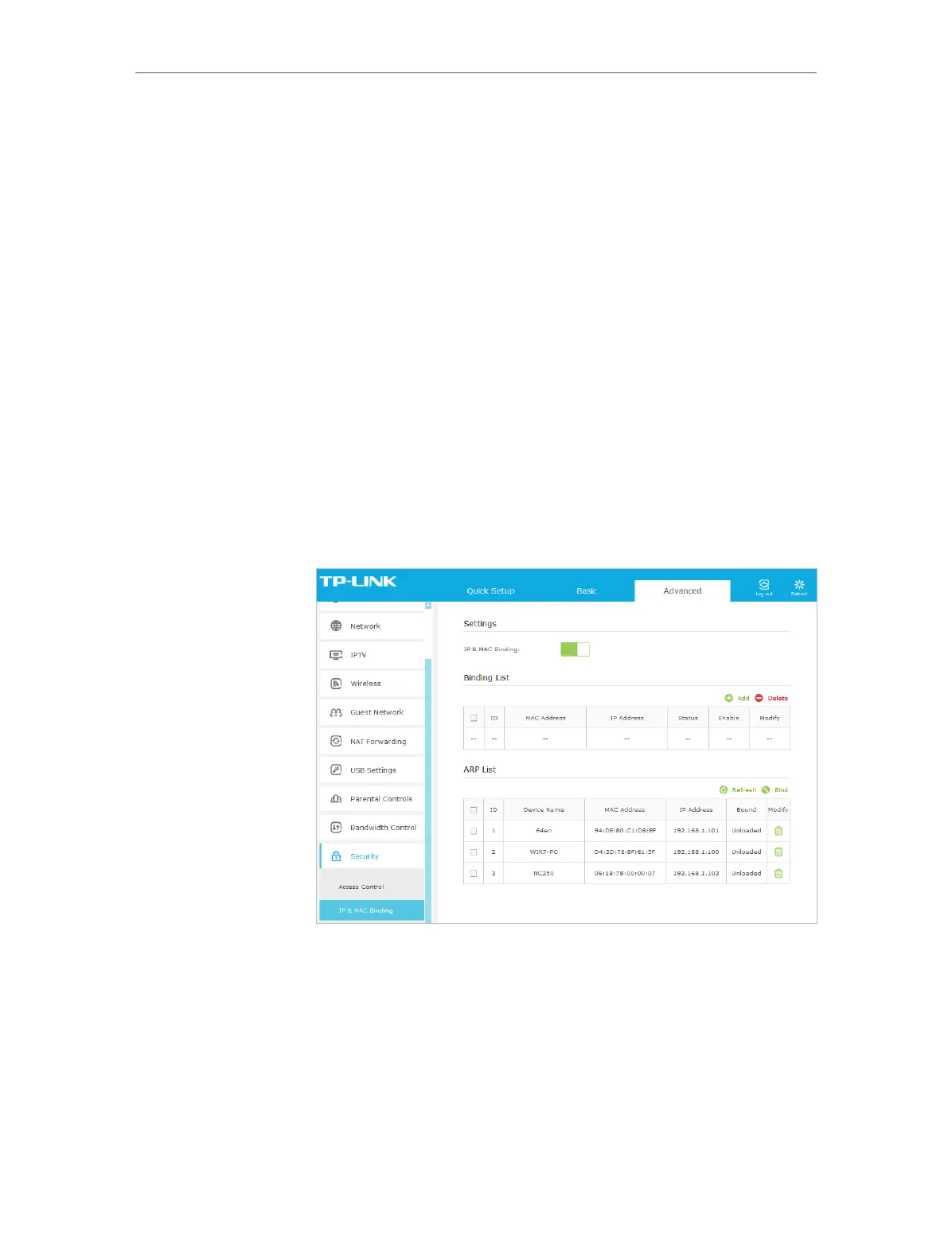 2. Go to Advanced > Security > IP & MAC Binding and enable IP