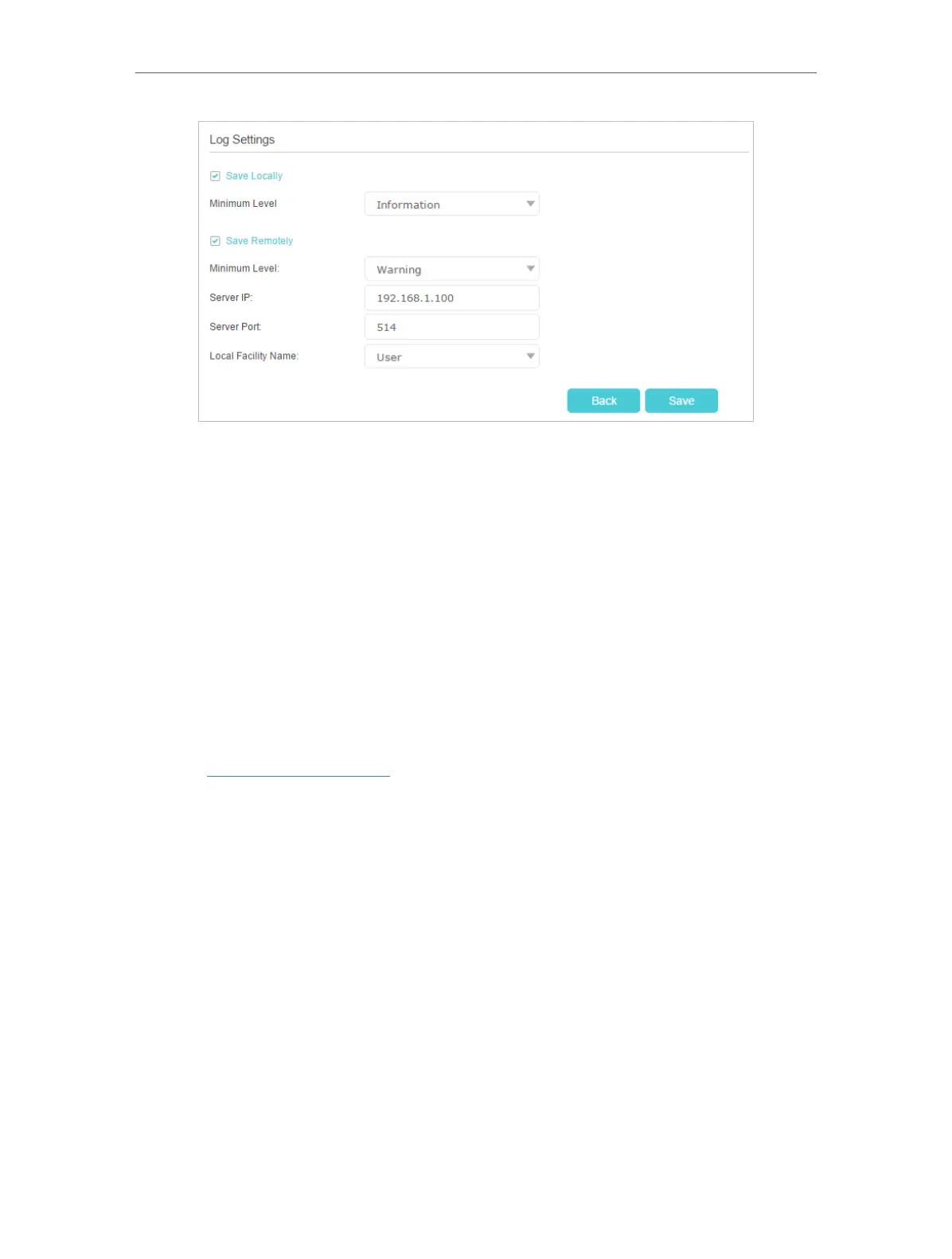• Save Locally: Select this option to cache the system log to the router’s local memory,