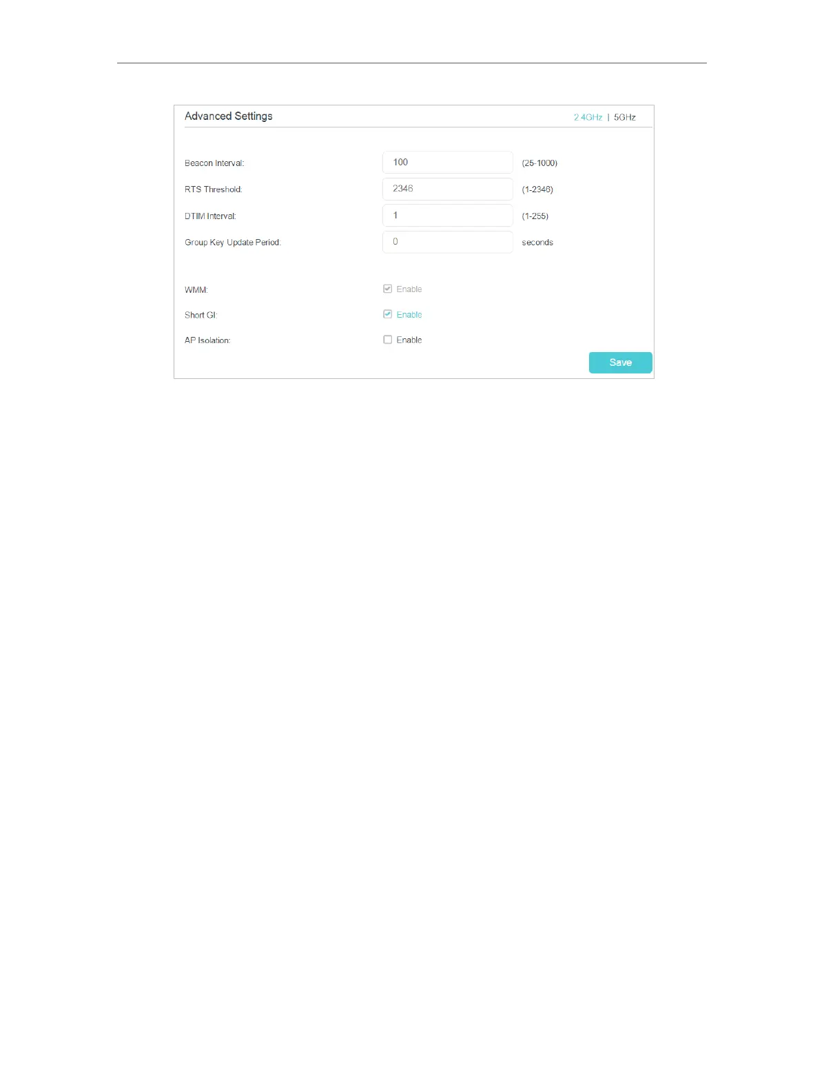 • Short GI: This feature is enabled by default and recommended to increase the data