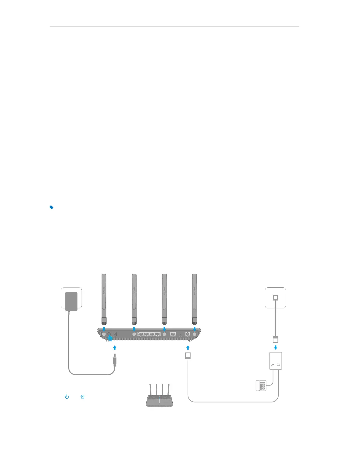 1. Connect the DSL line and power adapter. The electrical outlet shall be installed