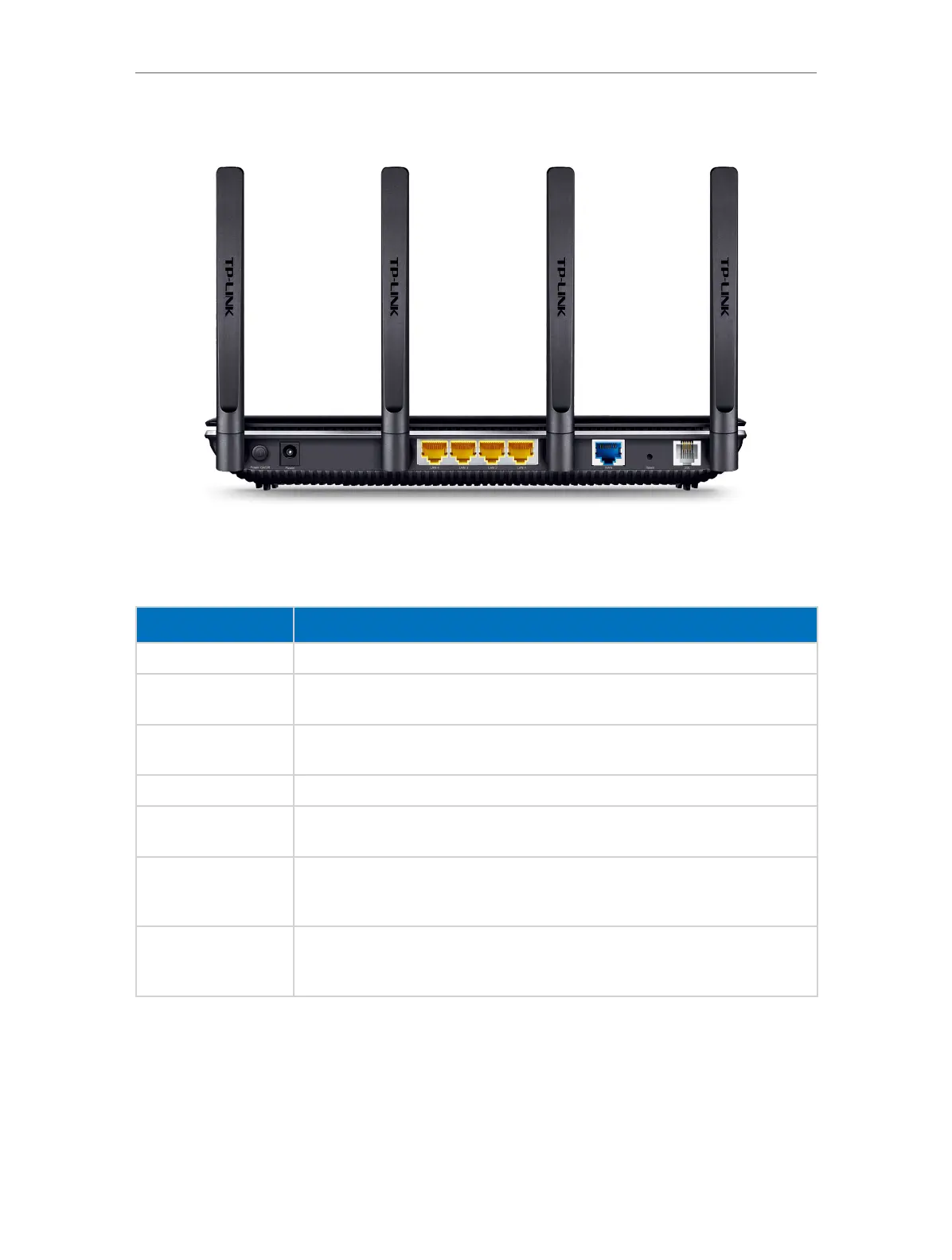 The back panel provides buttons, connection ports, and antennas. Refer to the following