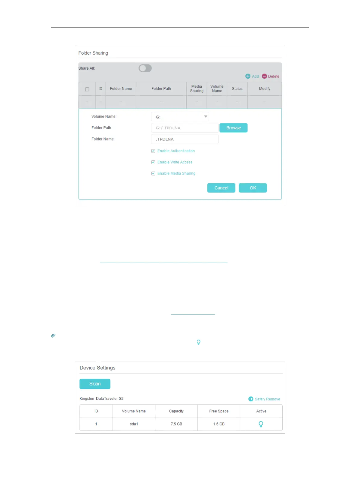 The modem router can share eight volumes at most. You can click on the page to detach the corresponding volume
