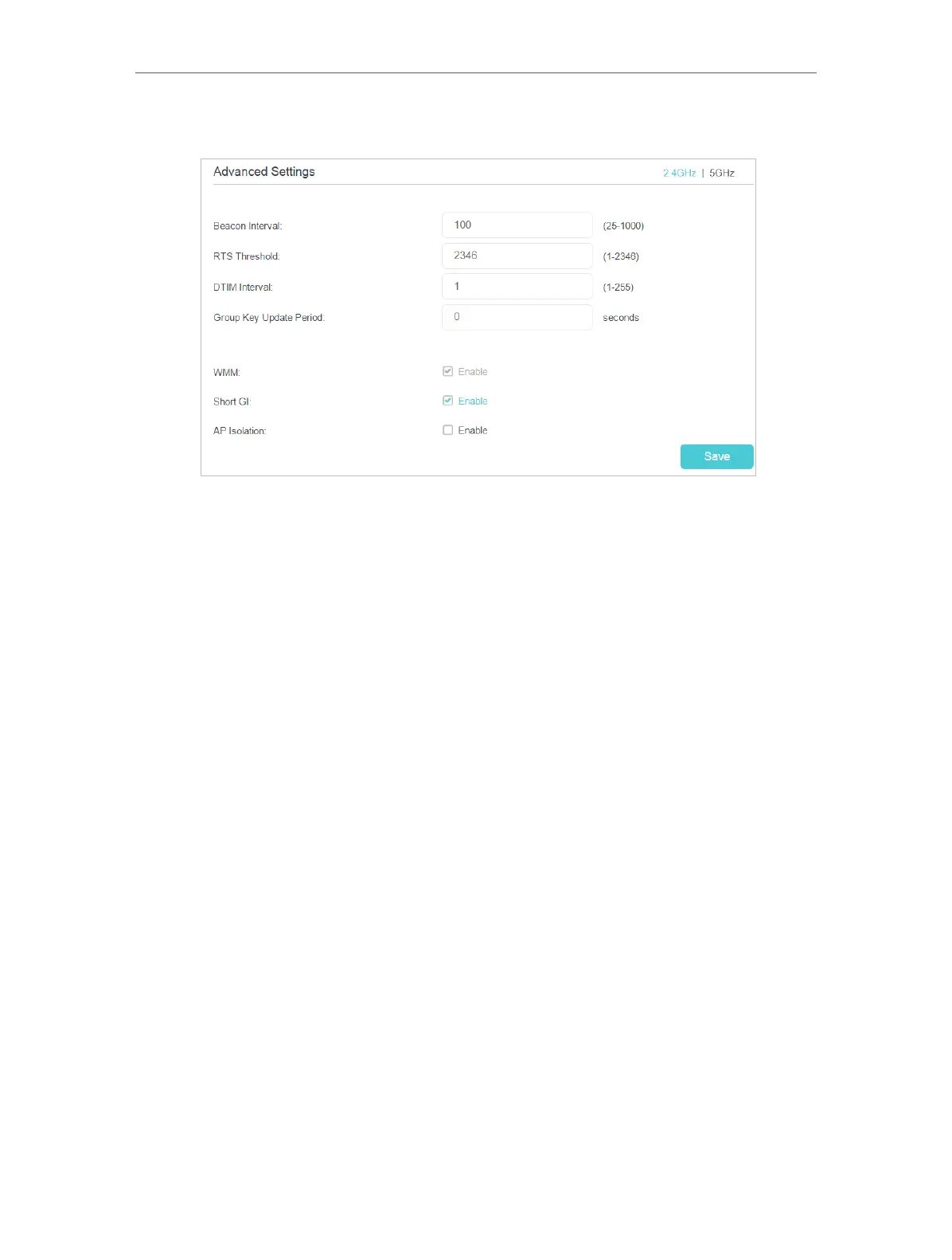 • Short GI: This feature is enabled by default and recommended to increase the data
