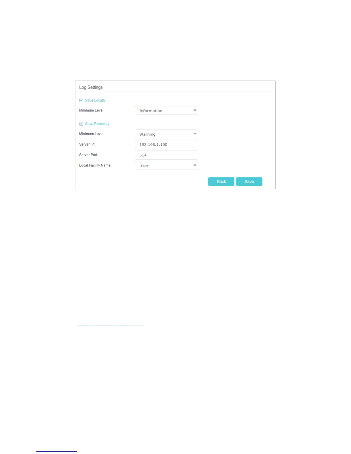 • Save Locally: Select this option to cache the system log to the router’s local memory,