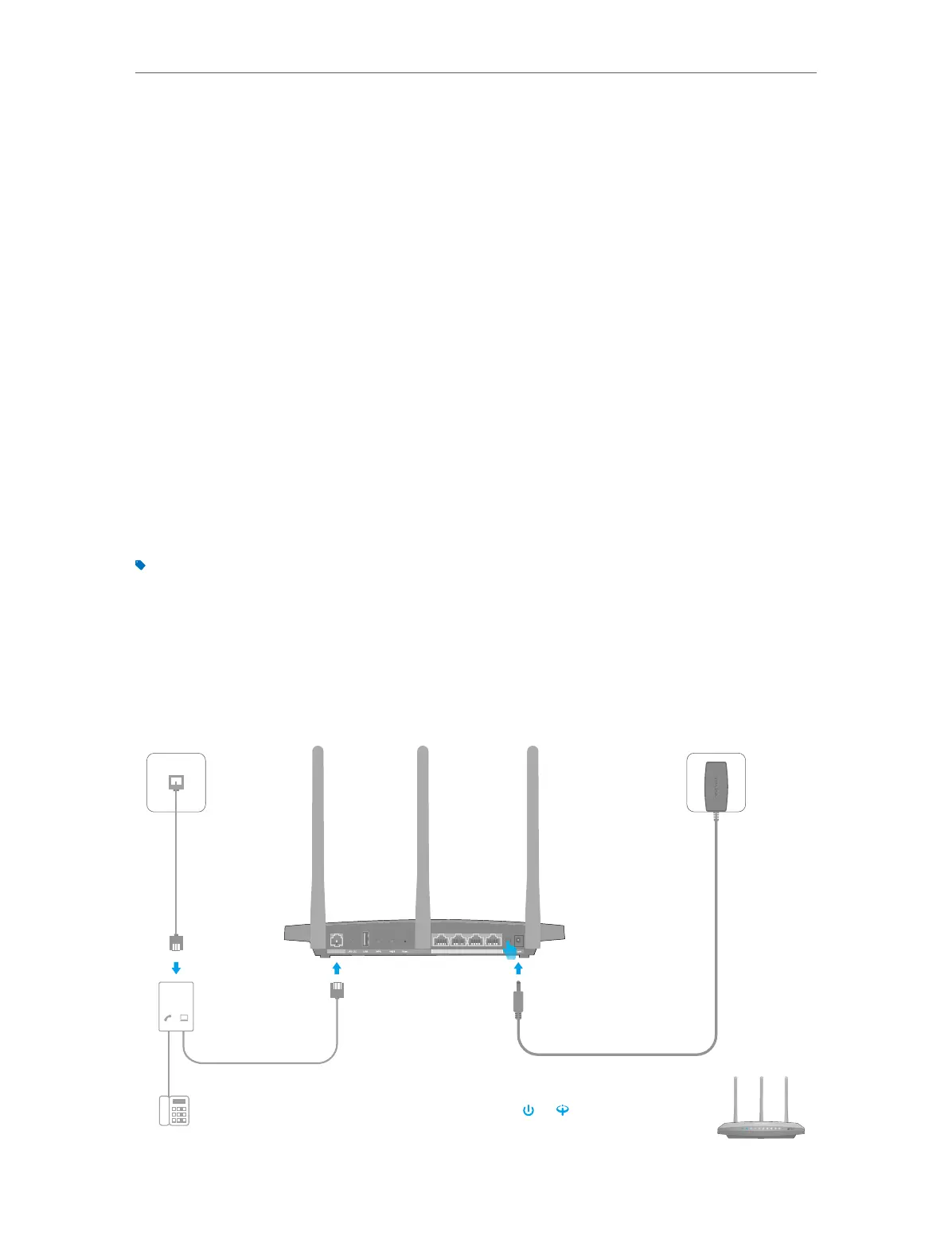 1. Connect the DSL line and power adapter. The electrical outlet shall be installed