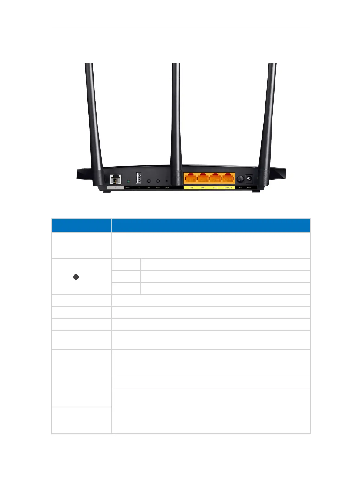 The back panel provides buttons, connection ports, and antennas. Refer to the following
