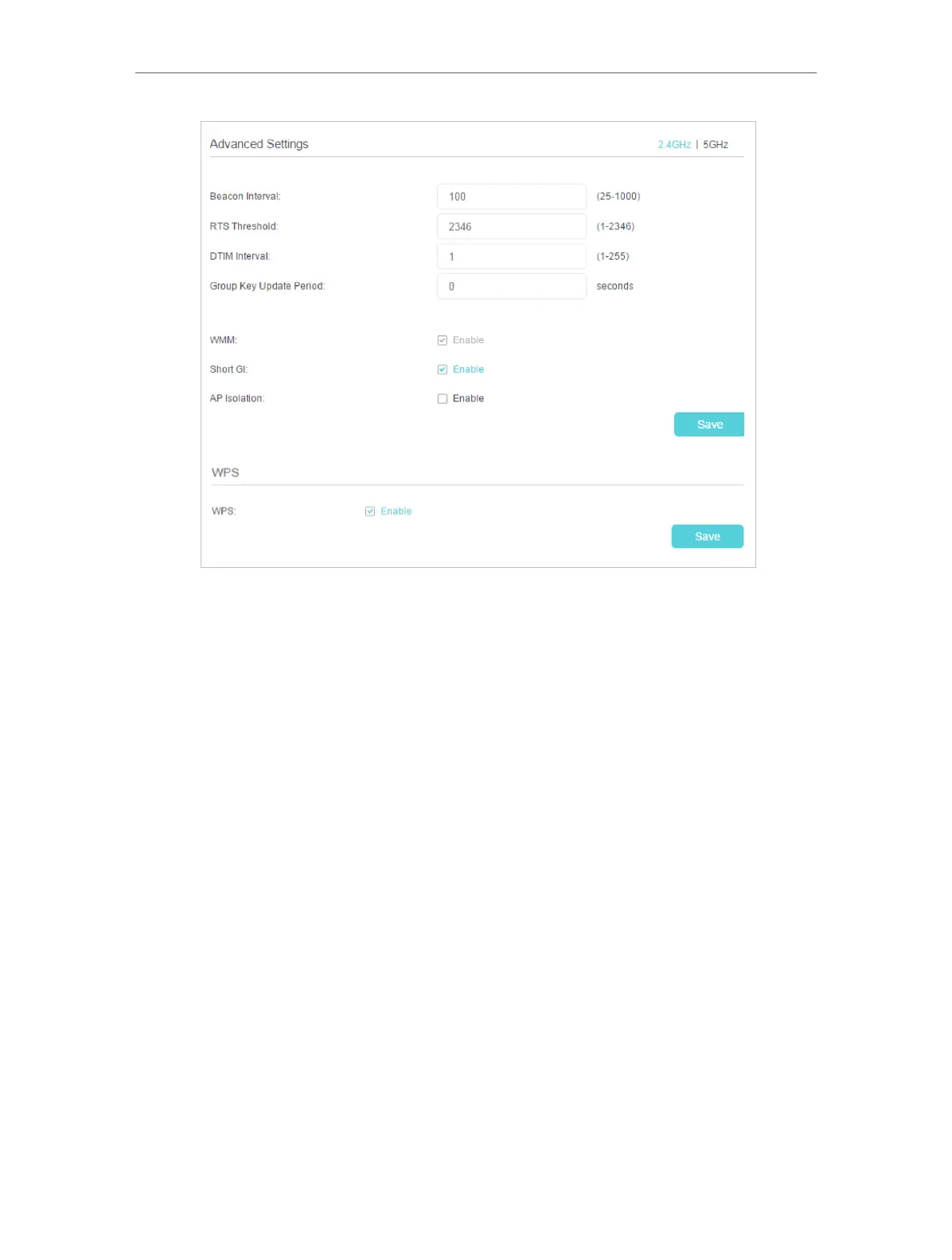 • Short GI: This feature is enabled by default and recommended to increase the data