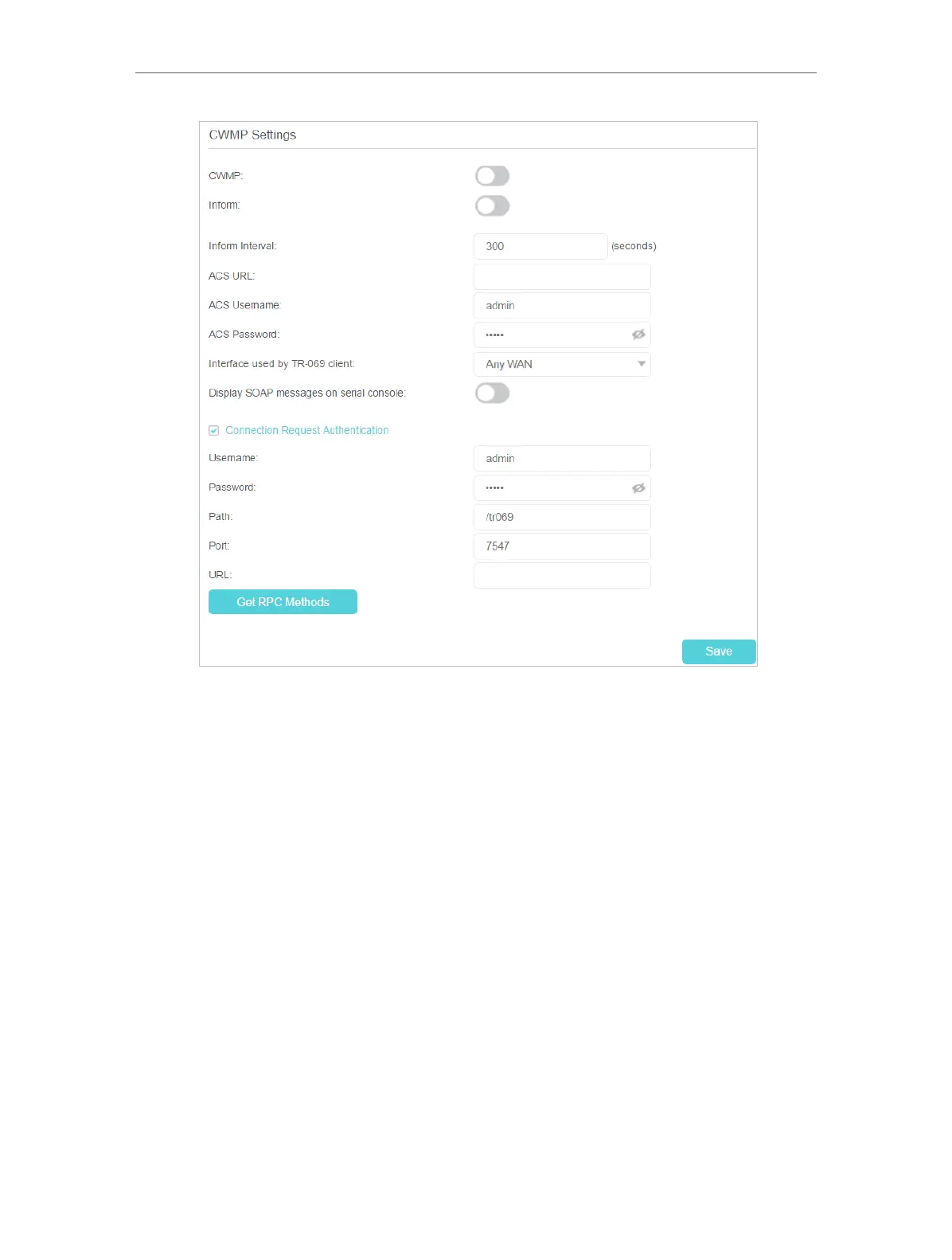 • CWMP: Toggle On to enable the CWMP (CPE WAN Management Protocol) feature.