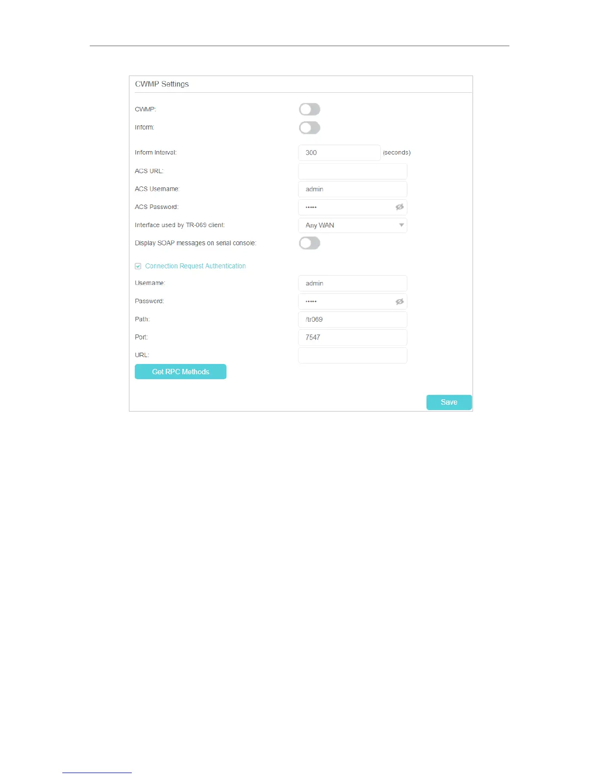 • CWMP: Toggle On to enable the CWMP (CPE WAN Management Protocol) feature.