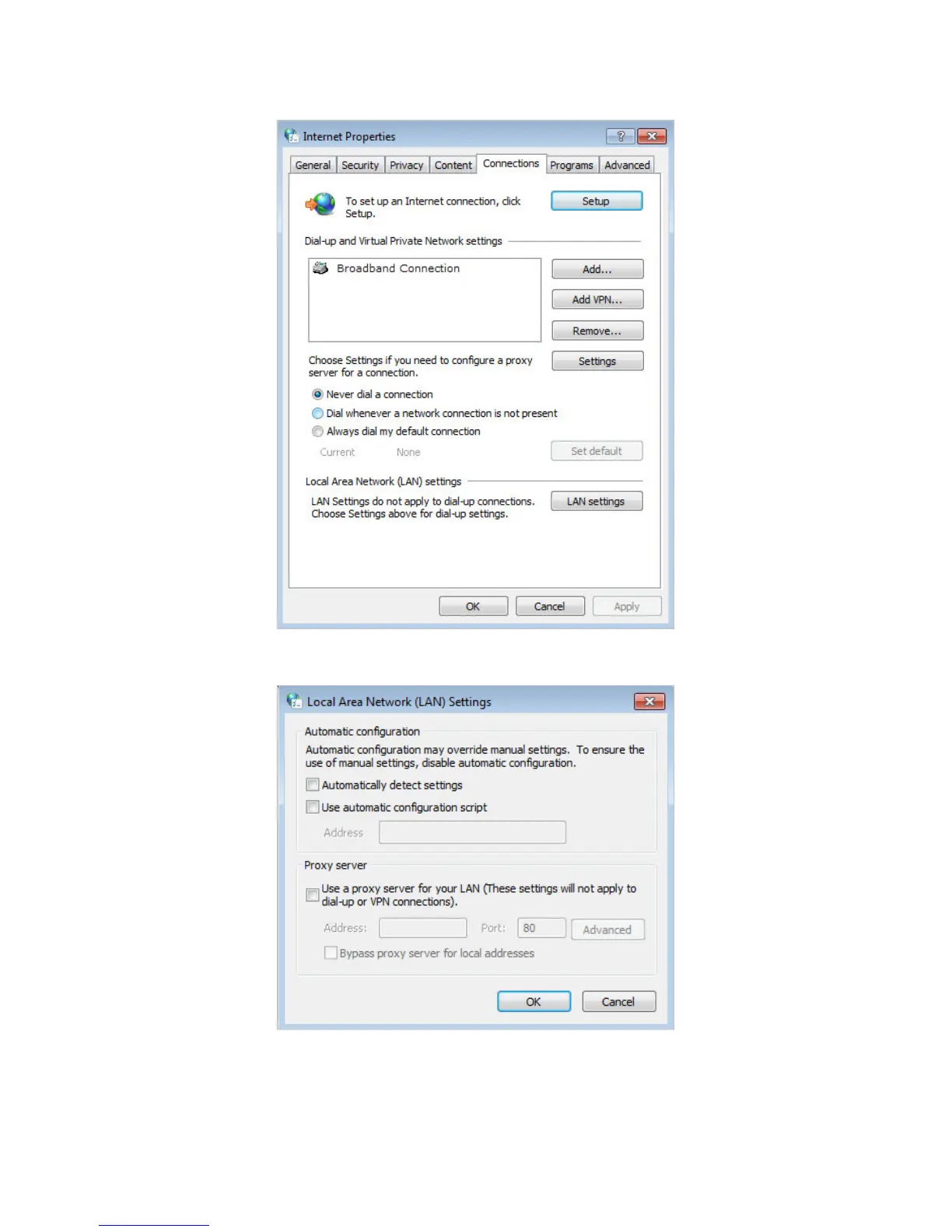 4 ) Click LAN settings, deselect the following three options and click OK;