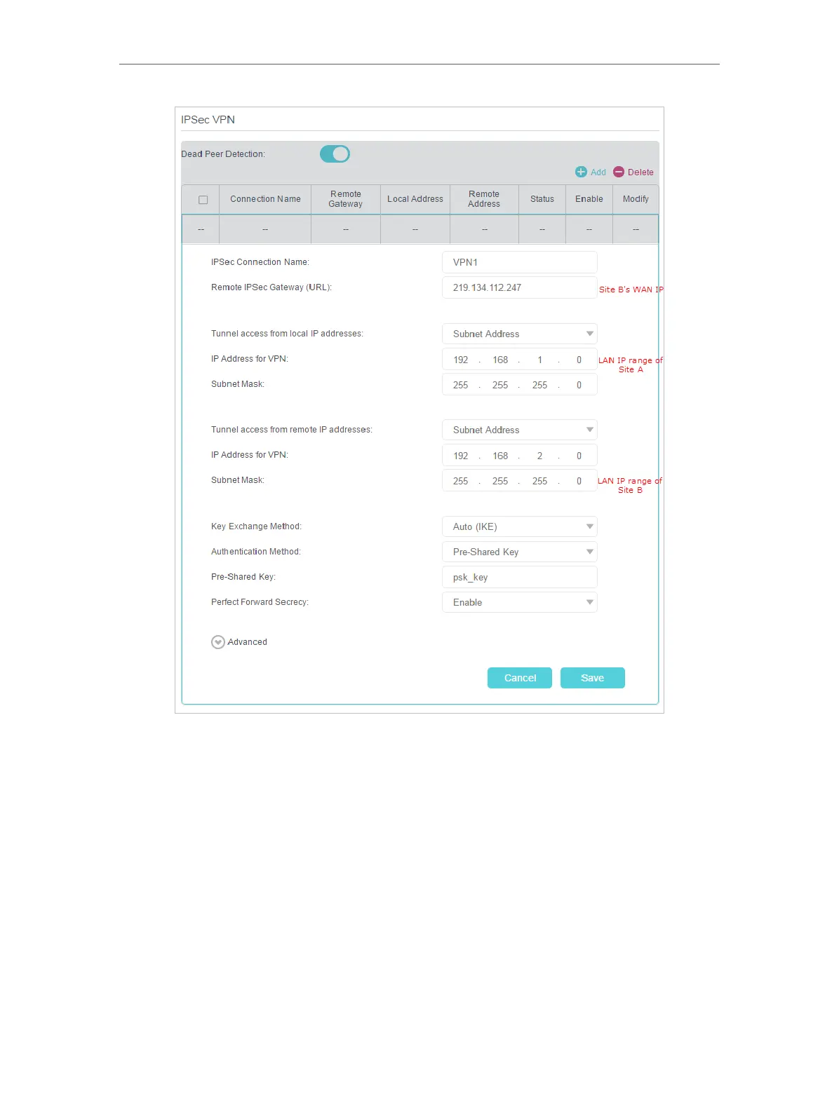 Address as an example. Input the LAN IP range of Site B in the IP Address for