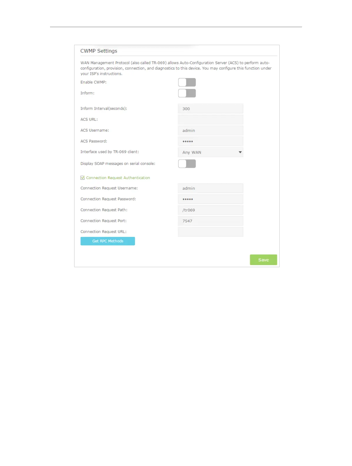 • Enable CWMP: Toggle On to enable the CWMP (CPE WAN Management Protocol)