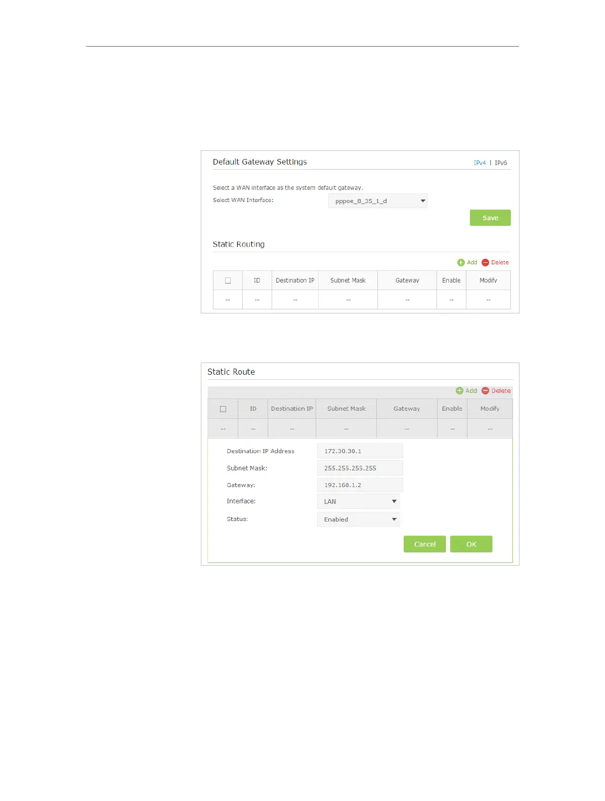 4. Click Add to add a new static routing entry. Finish the settings