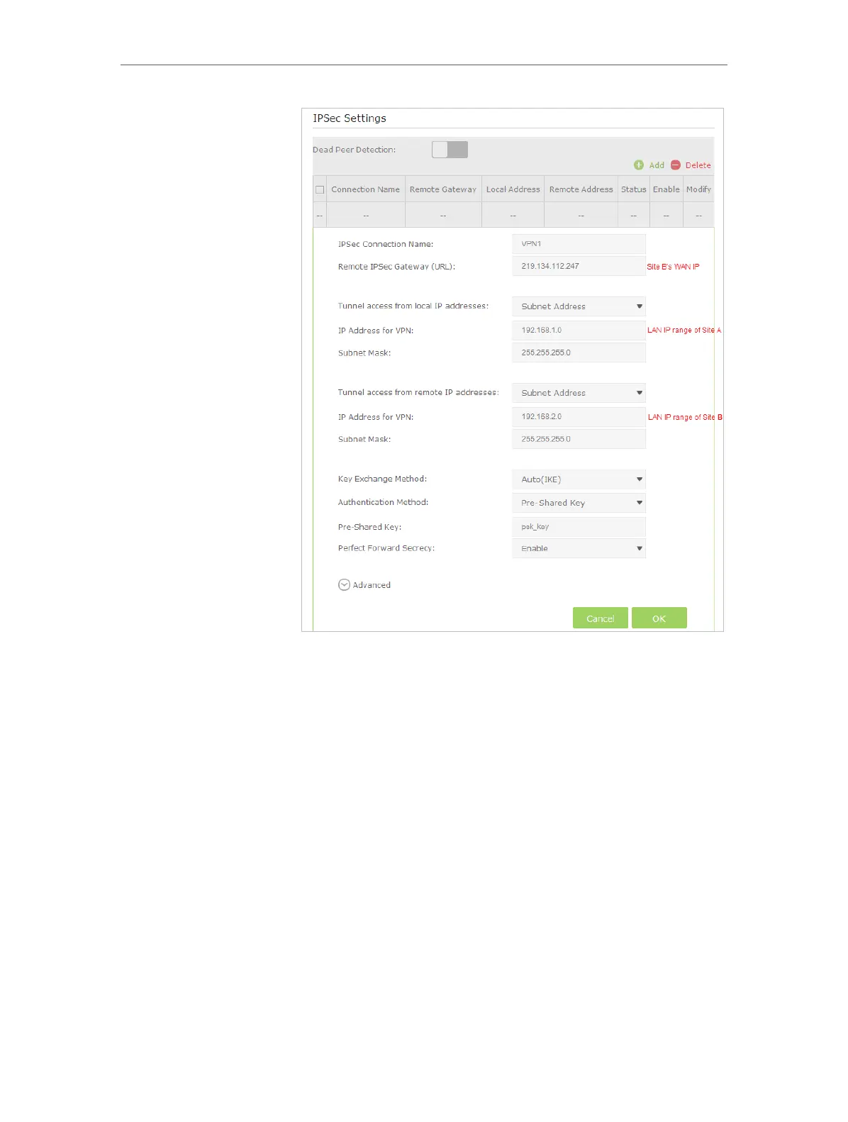 range of Site A in the IP Address for VPN column, and input