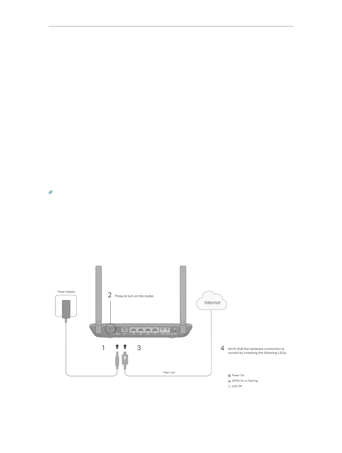 1. onnect the power adapter and the fiber line. The electrical outlet shall be installed