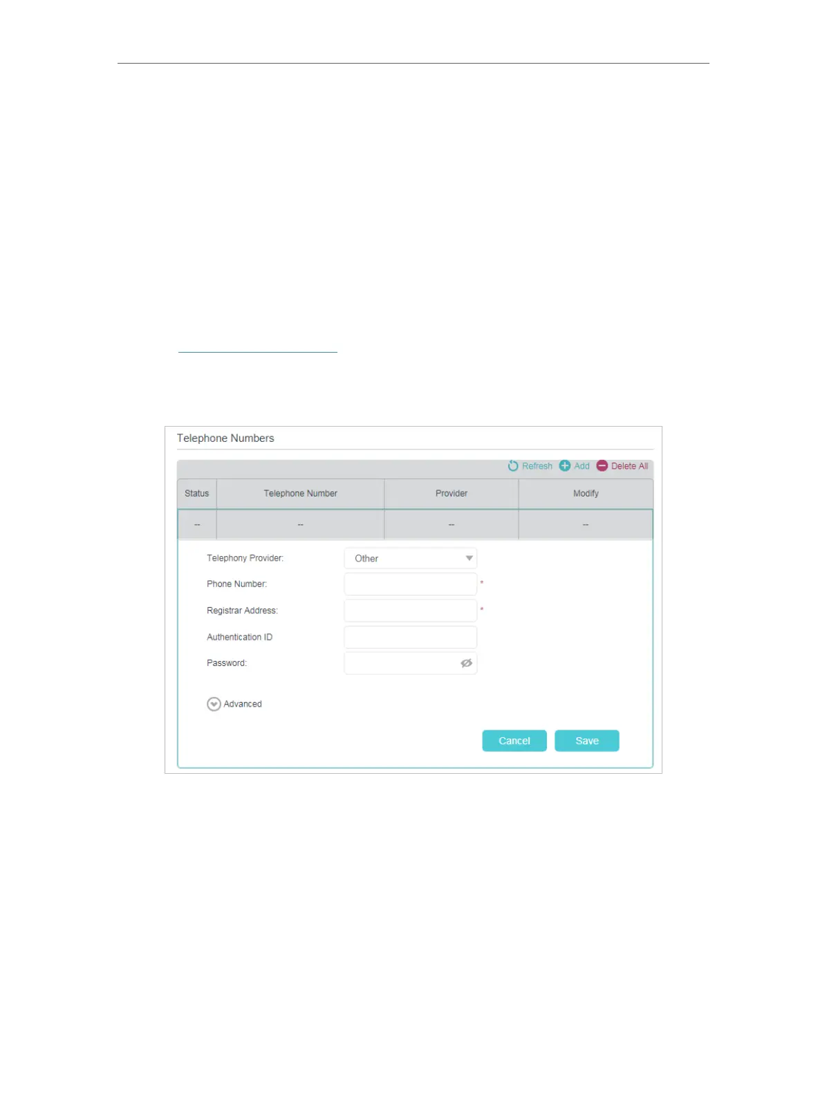 2. Go to Advanced > Telephony > Telephone Numbers to open the configuration page.