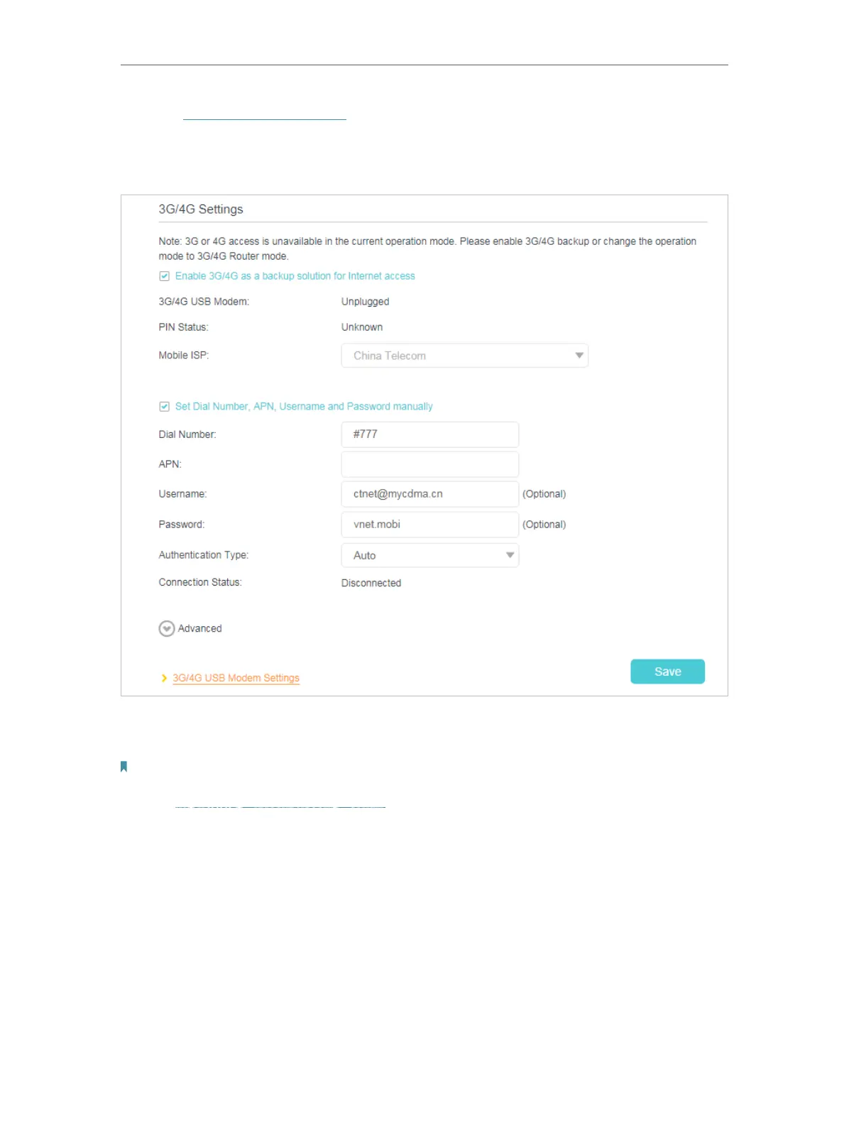 3. Go to Advanced > USB Settings > 3G/4G Settings, and select the box of Enable
