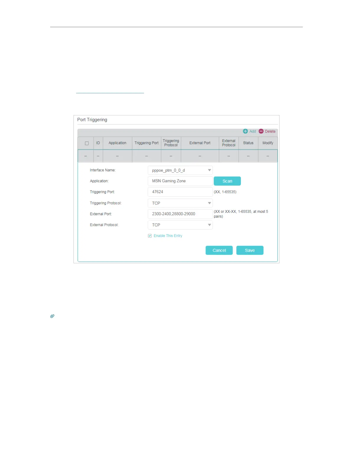 Follow the steps below to configure the port triggering rules: