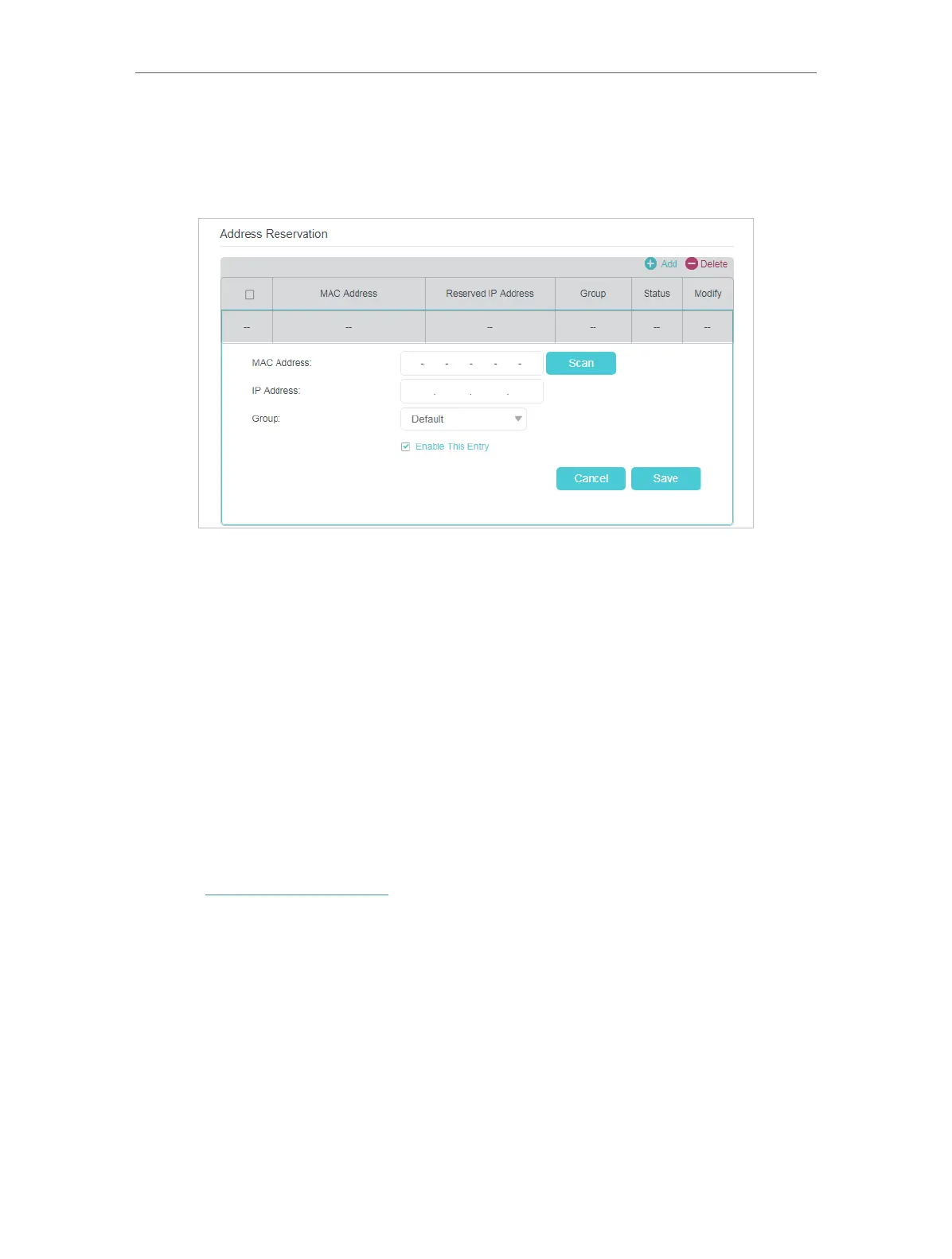 3. Scroll down to locate the Address Reservation table and click Add to add an address