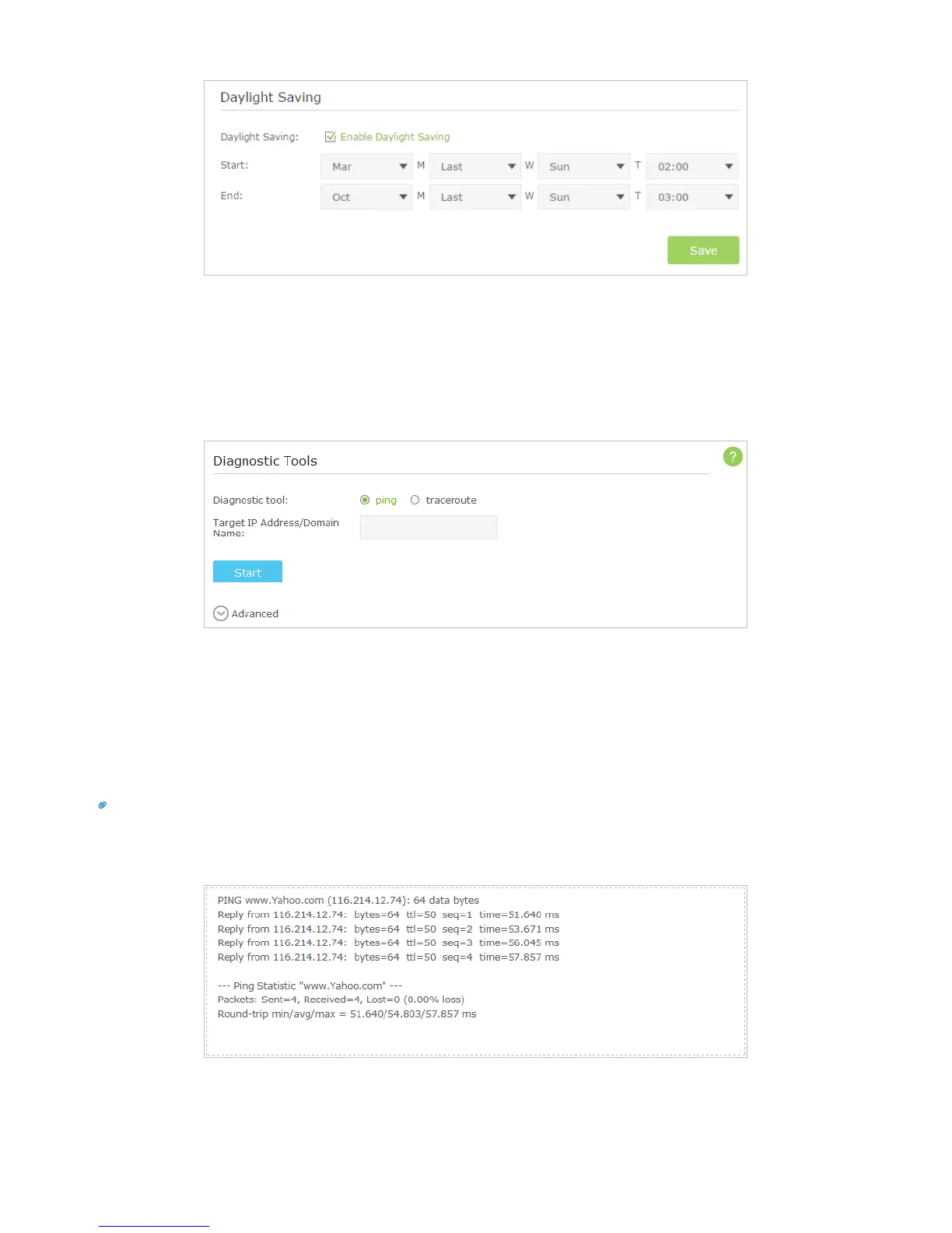 Diagnostics is used to test the connectivity between the router and the host or other network devices.