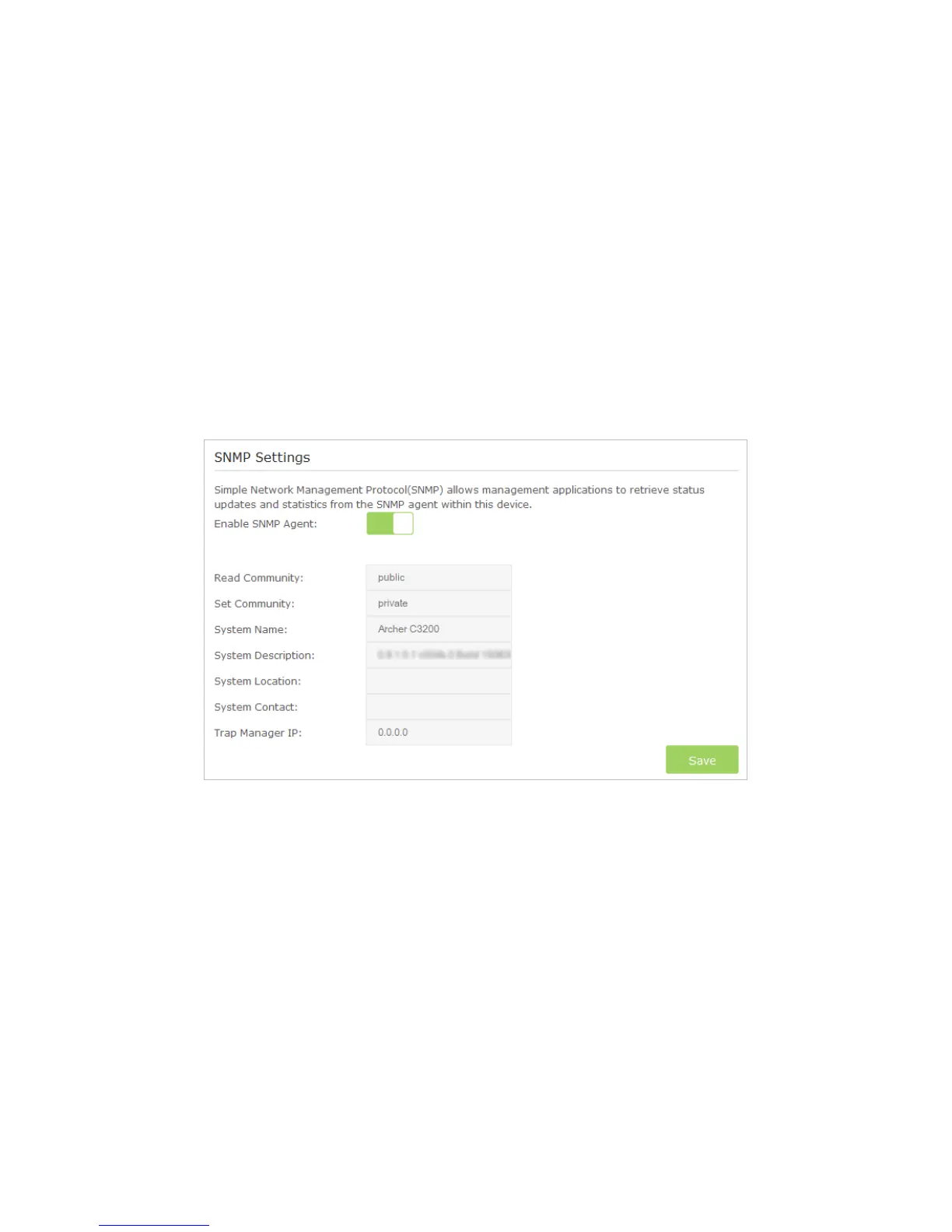 • Enable SNMP Agent: Toggle On to enable the built-in SNMP agent that allows the router to operate as the operational role