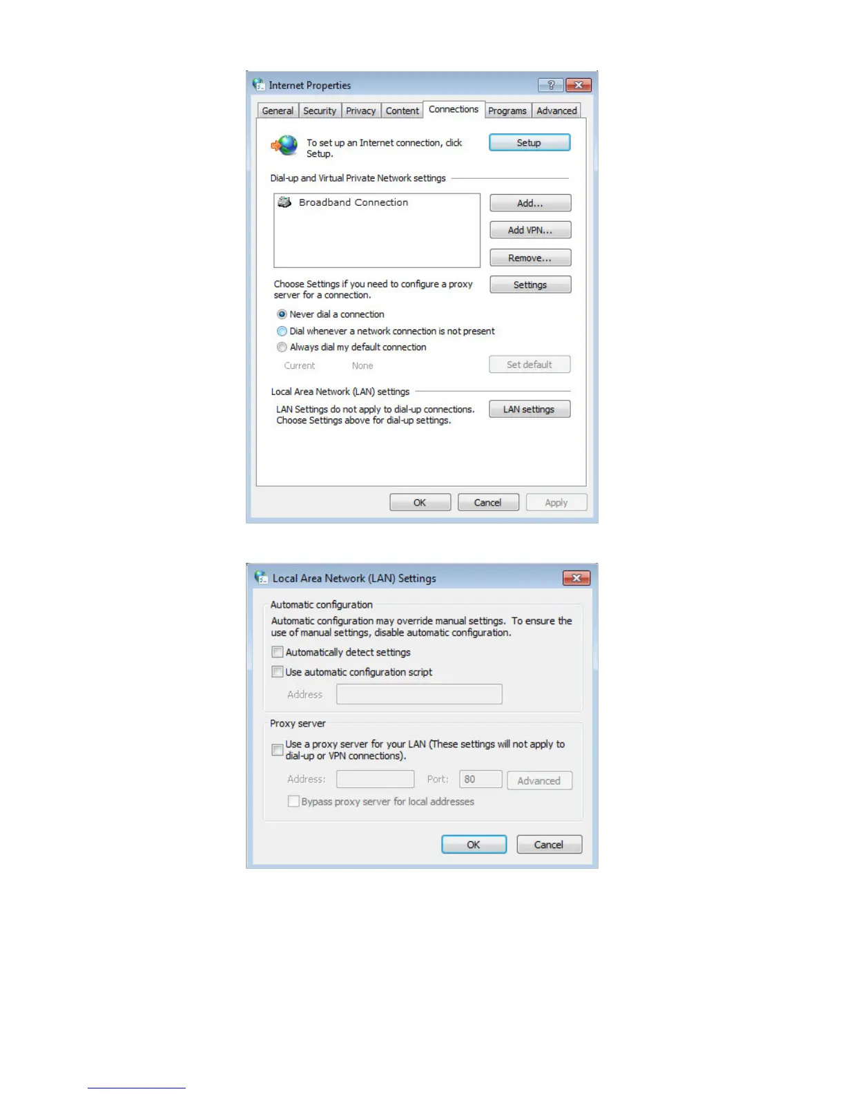 4 ) Click LAN settings, deselect the following three options and click OK;