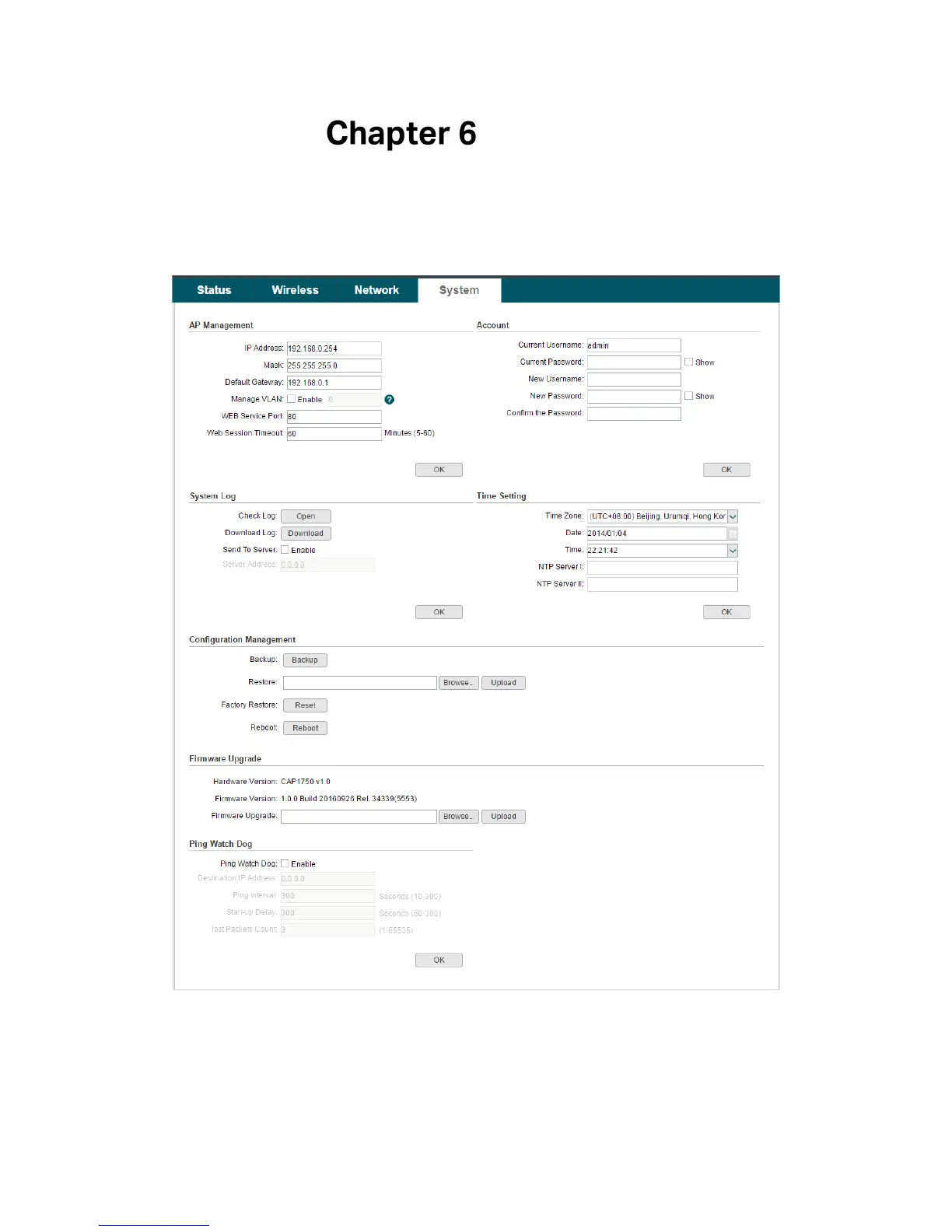 user account, system log, time setting, and realize functions including reboot, reset,