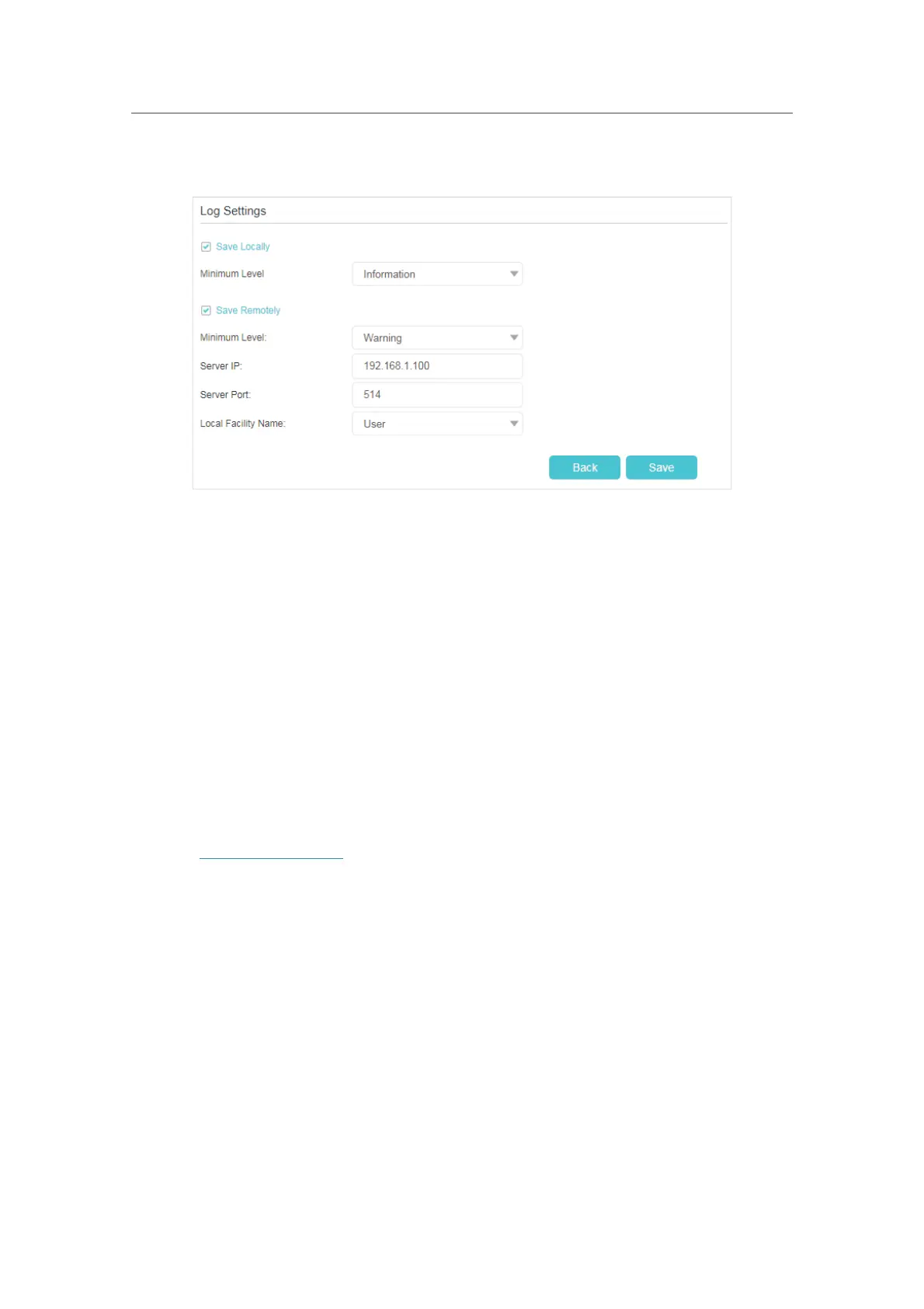 the minimum level of system log to be saved from the drop-down list and enter the