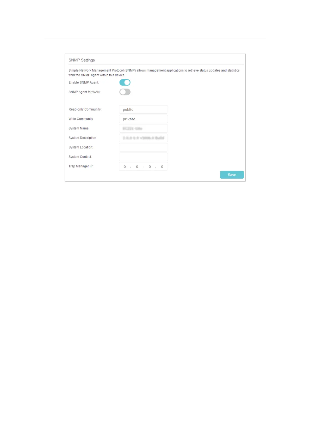 • Enable SNMP Agent/SNMP Agent for WAN: Turn on to enable the built-in SNMP agent