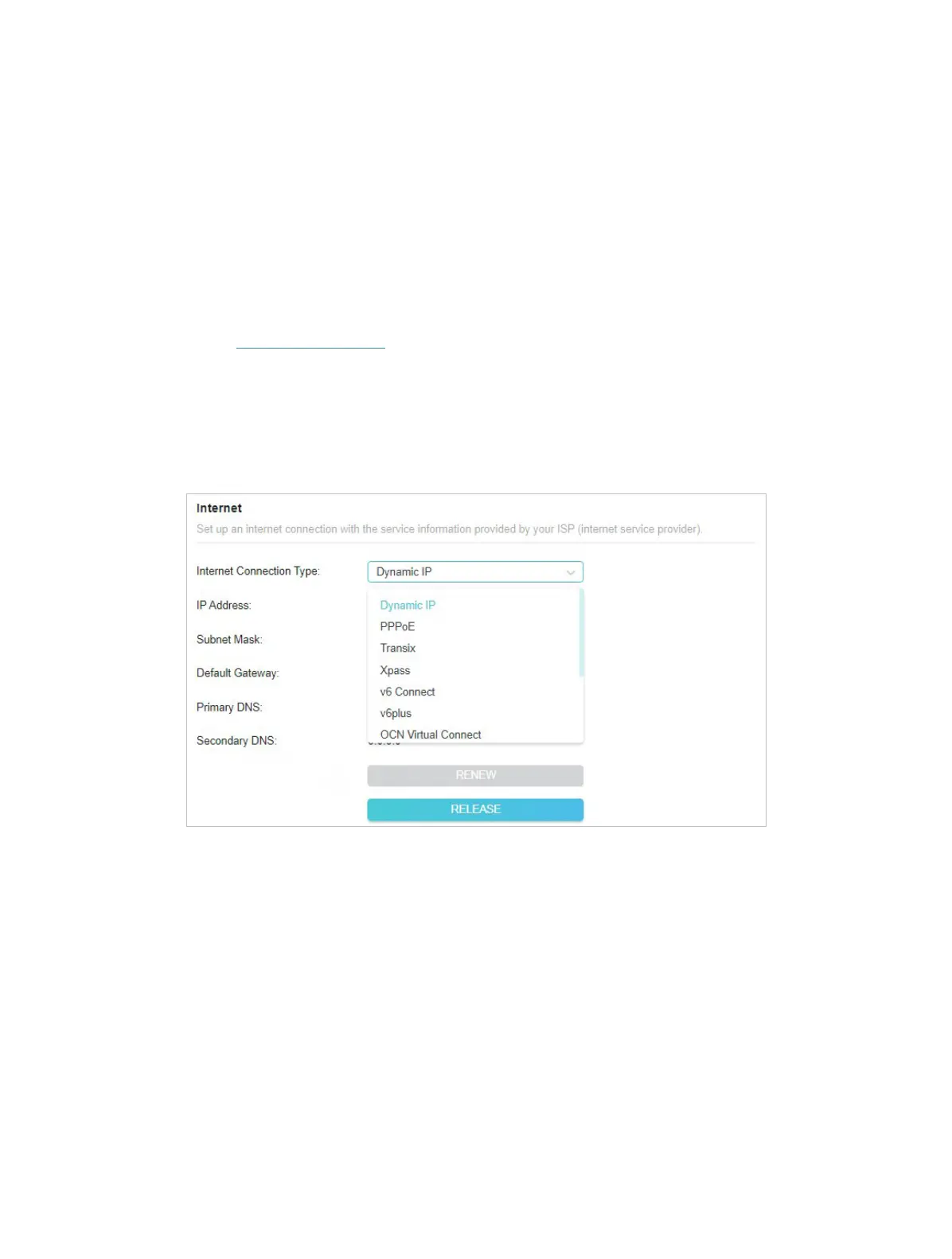 1 ) Confirm your internet connection type, which can be learned from the ISP.