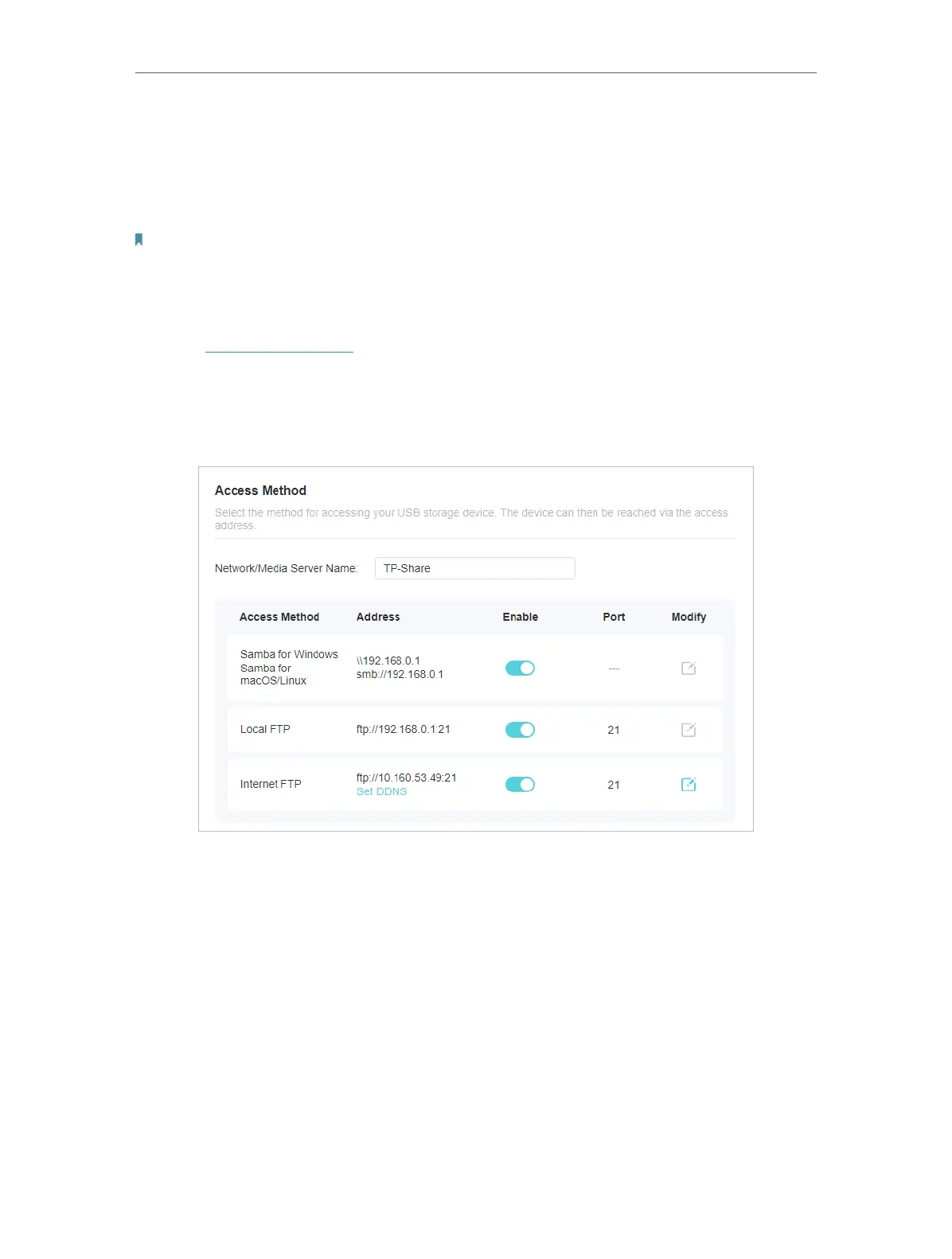 4. Refer to the following table to access your USB disk remotely.