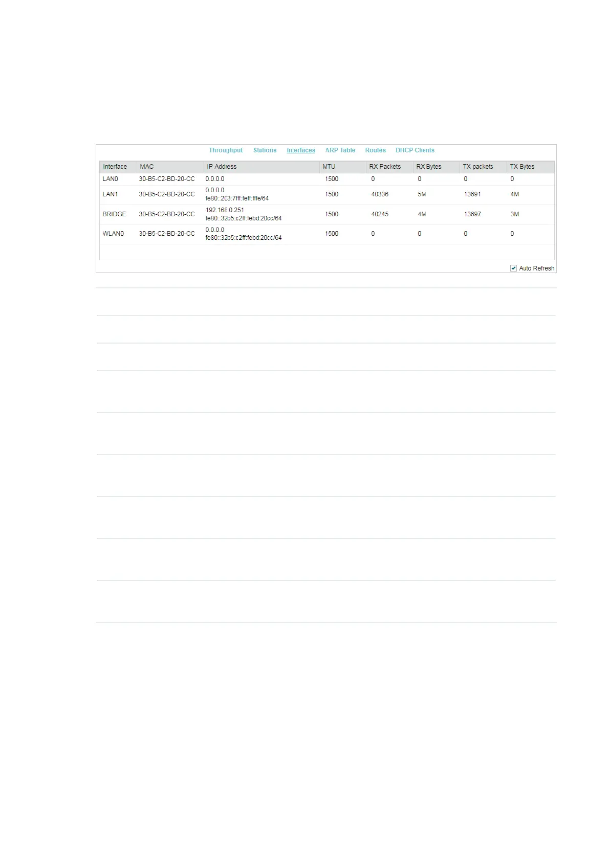 TX Bytes Displays the total amount of data (in bytes) sent by the interface after the