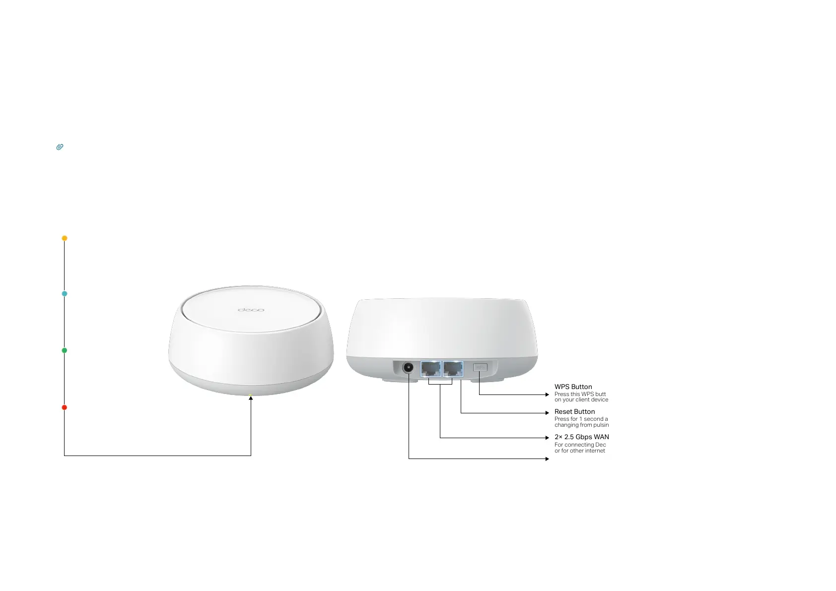 Each Deco has an LED that changes color according to its status, a WPS button, two 2.5 Gbps WAN/LAN ports, a power slot, and a Reset button.