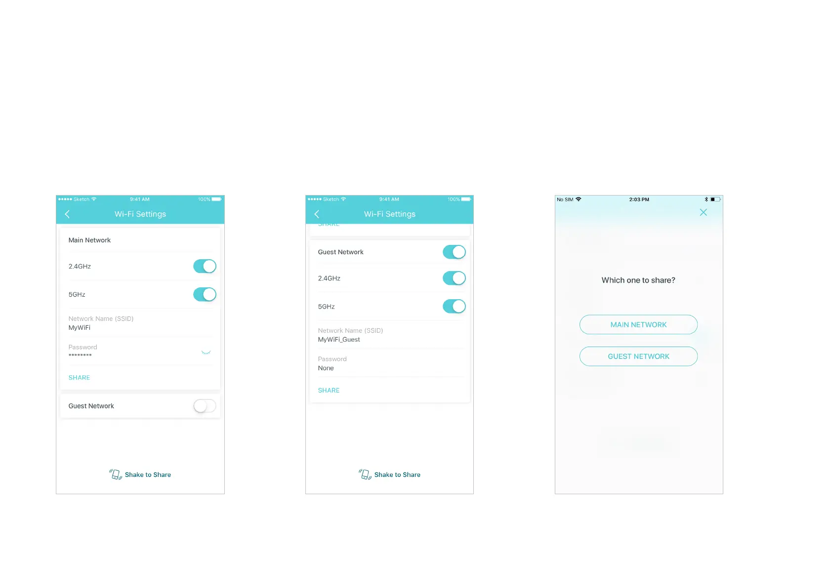 Customize the network name and password of your main network or create a separate network for guests, and shake your device to share the network
