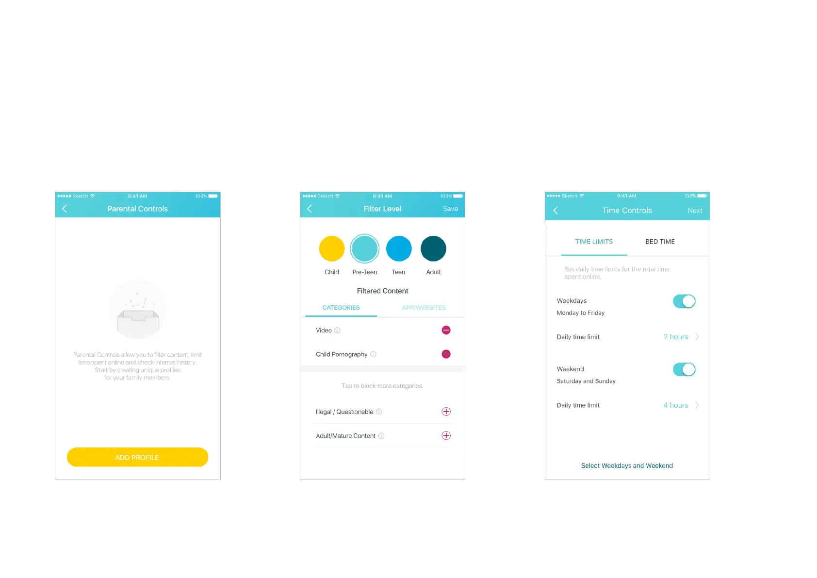 Create proles for family members and specify the devices that belong to each. Set individualized parental controls including when and for how long