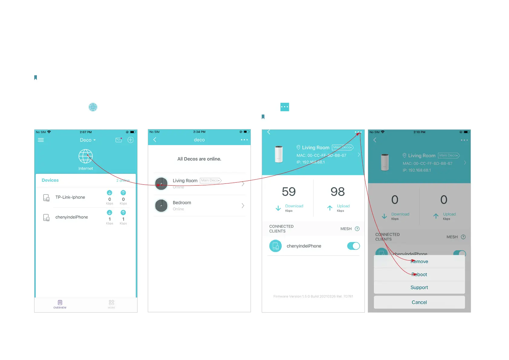 1. In Overview, tap . 3. Tap to remove or reboot the Deco.