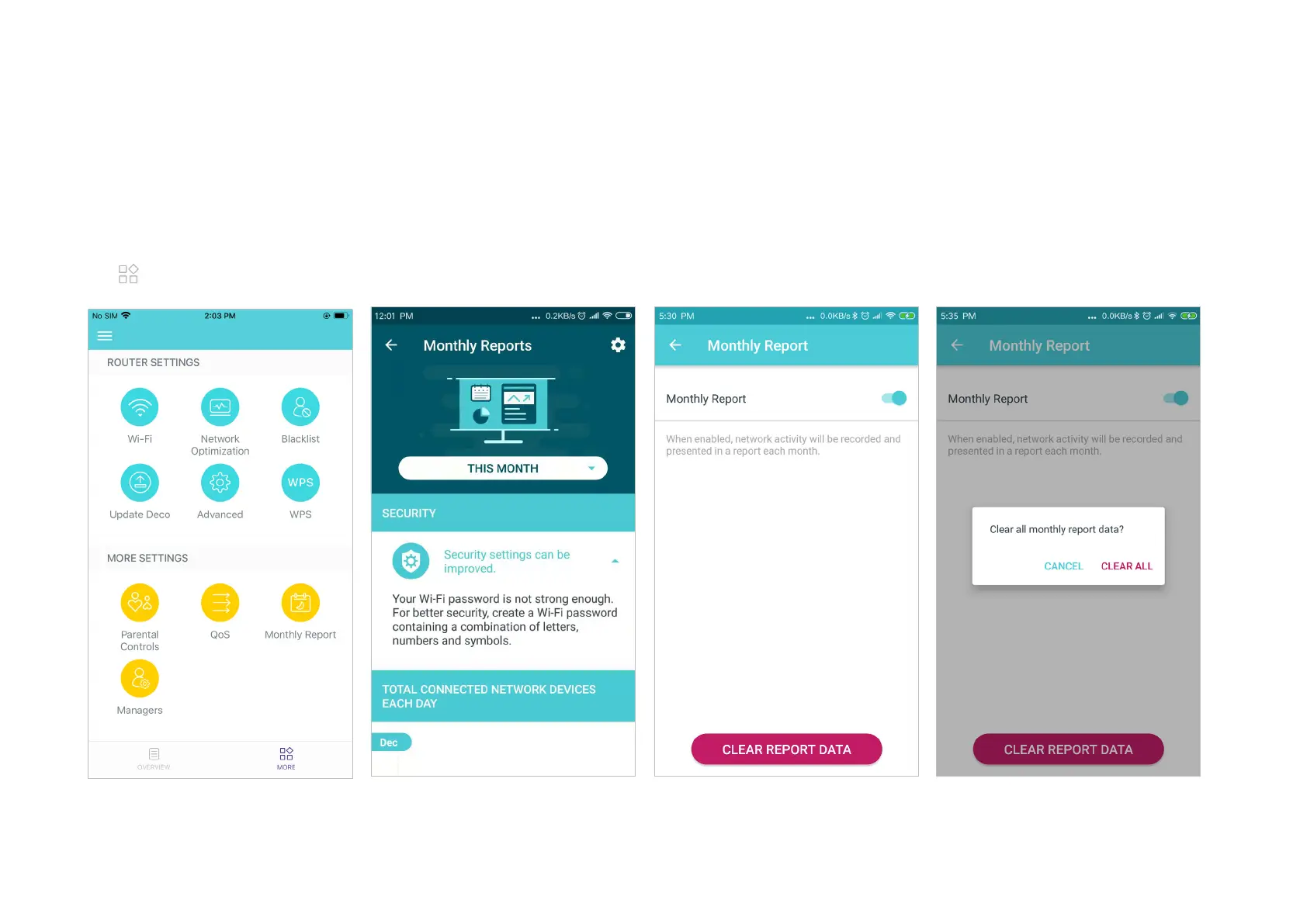View monthly reports. Enable or disable monthly report. Clear monthly report data.